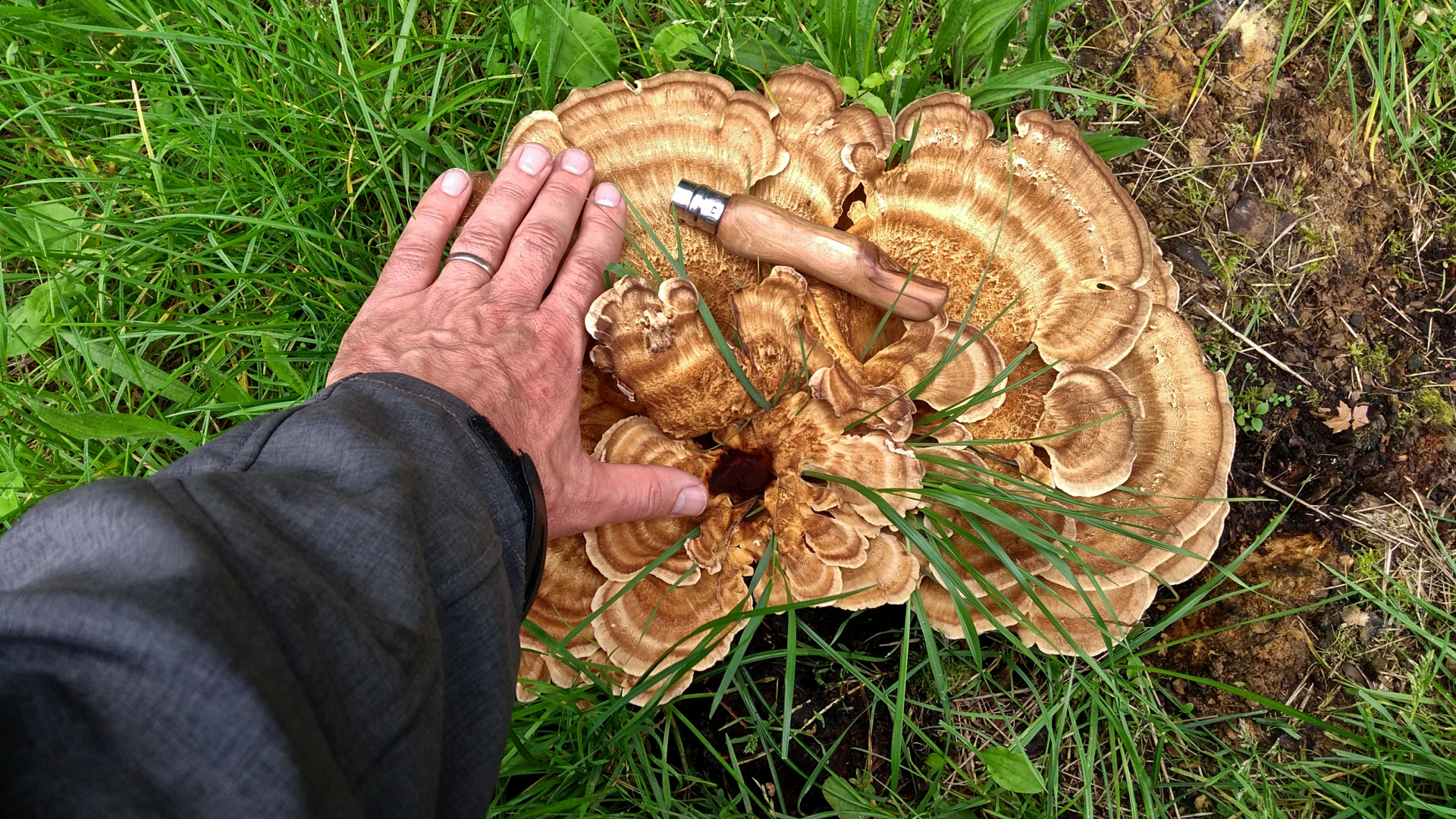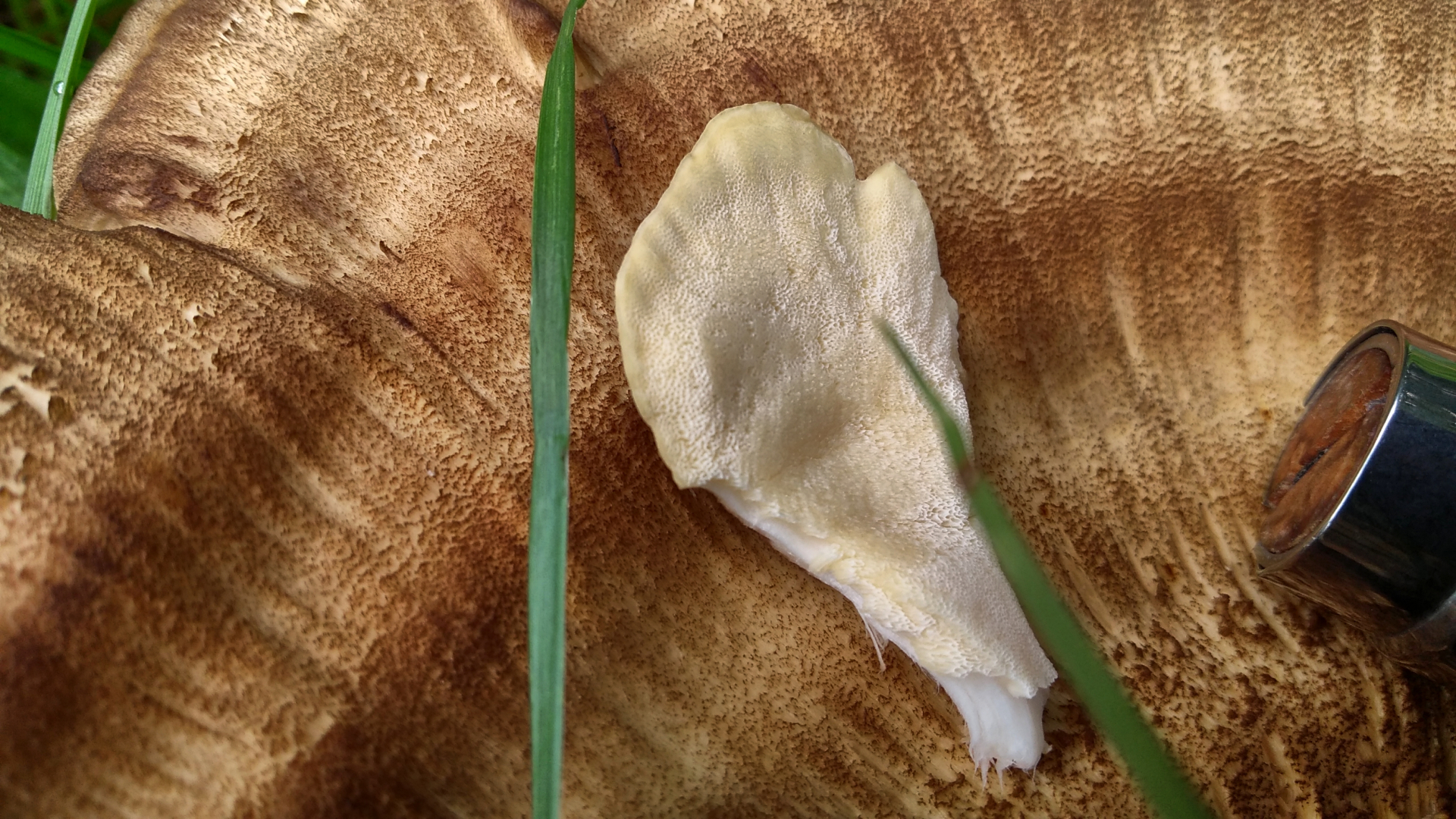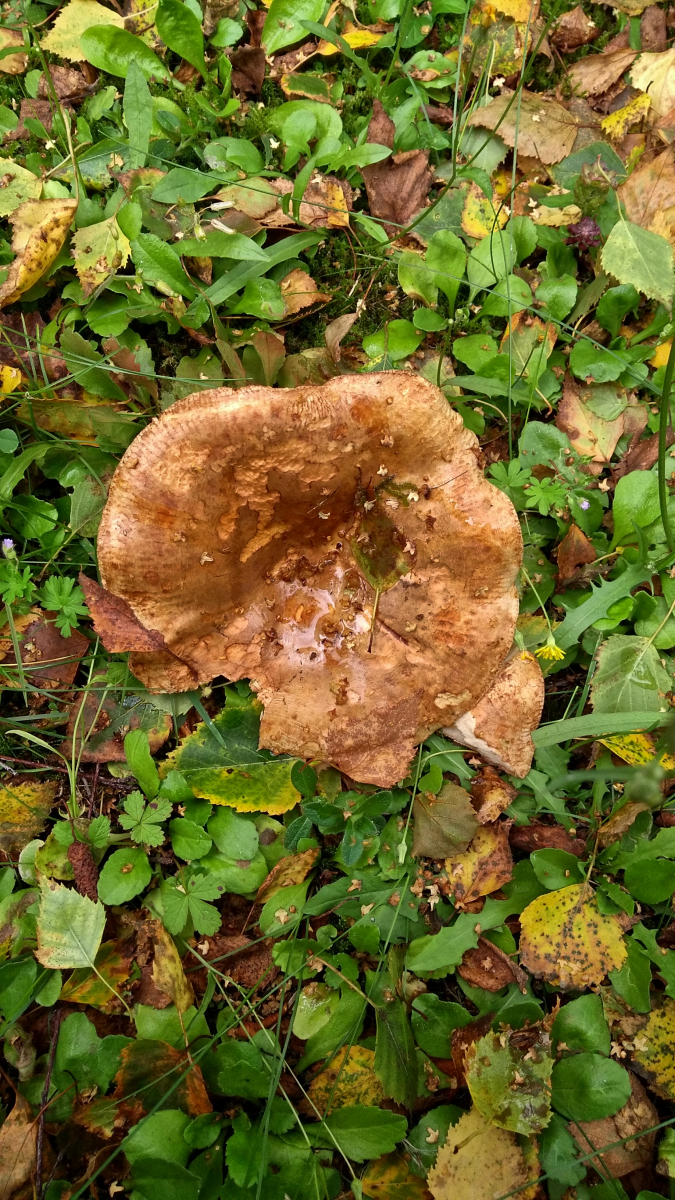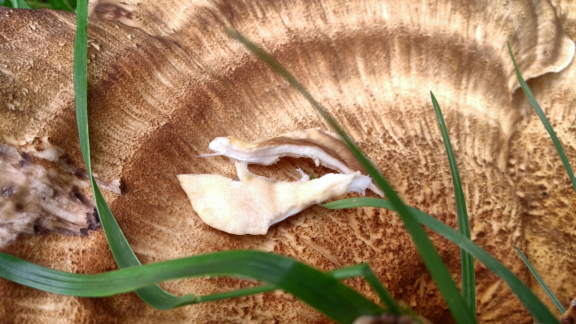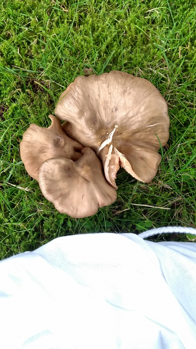 Ich bin mit einigermaßen sicher, einen Riesenporling (Meripilus giganteus) gefunden zu haben. Der Pilz wächst auch einem sehr kurzen Stumpf und deckt diesen komplett ab. Ich konnte also die Baumart nicht bestimmen. Vermutlich aber Laubbaum, weil ein ehemaliger Strassenbegleiter in einer Siedlung.