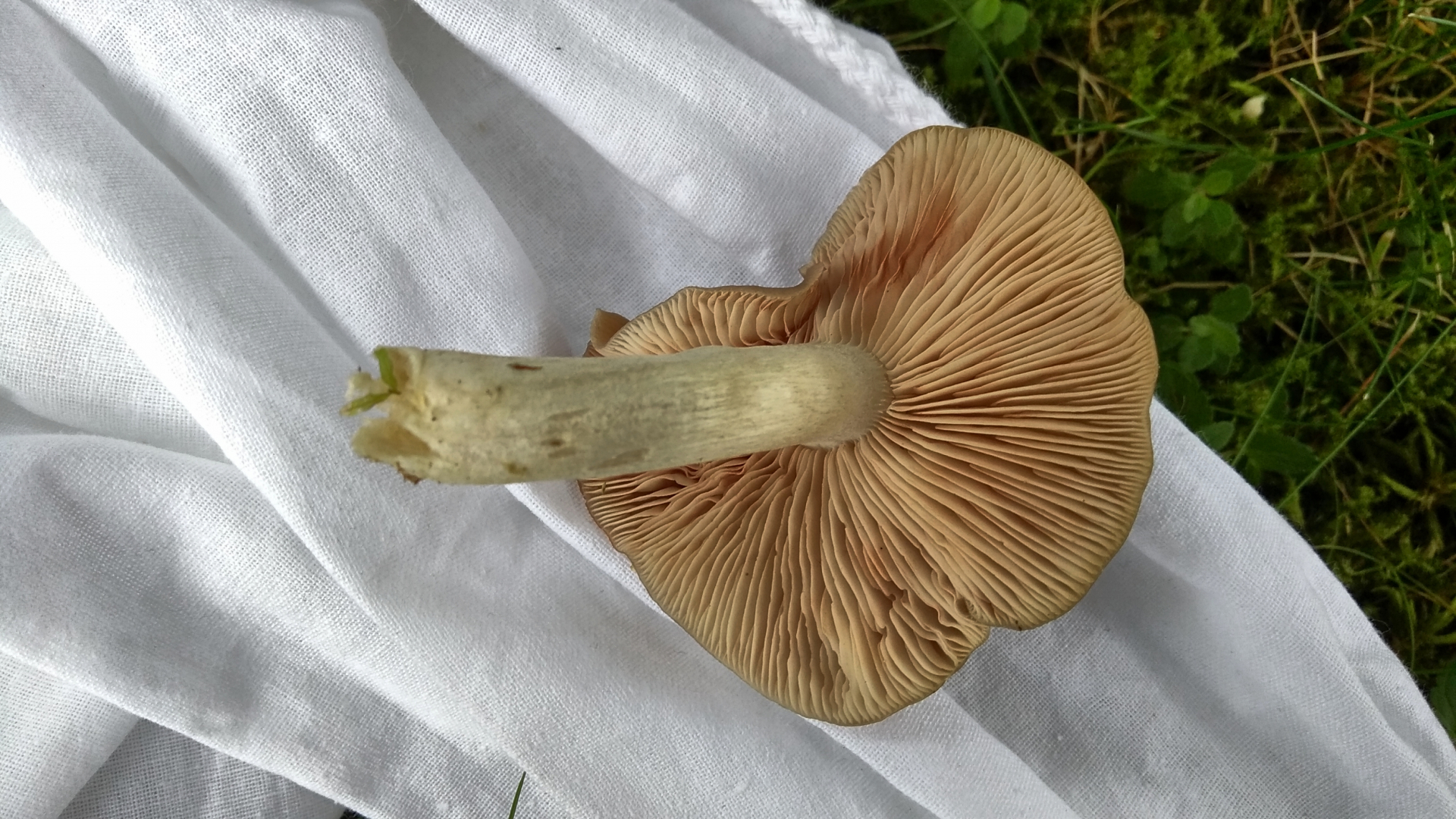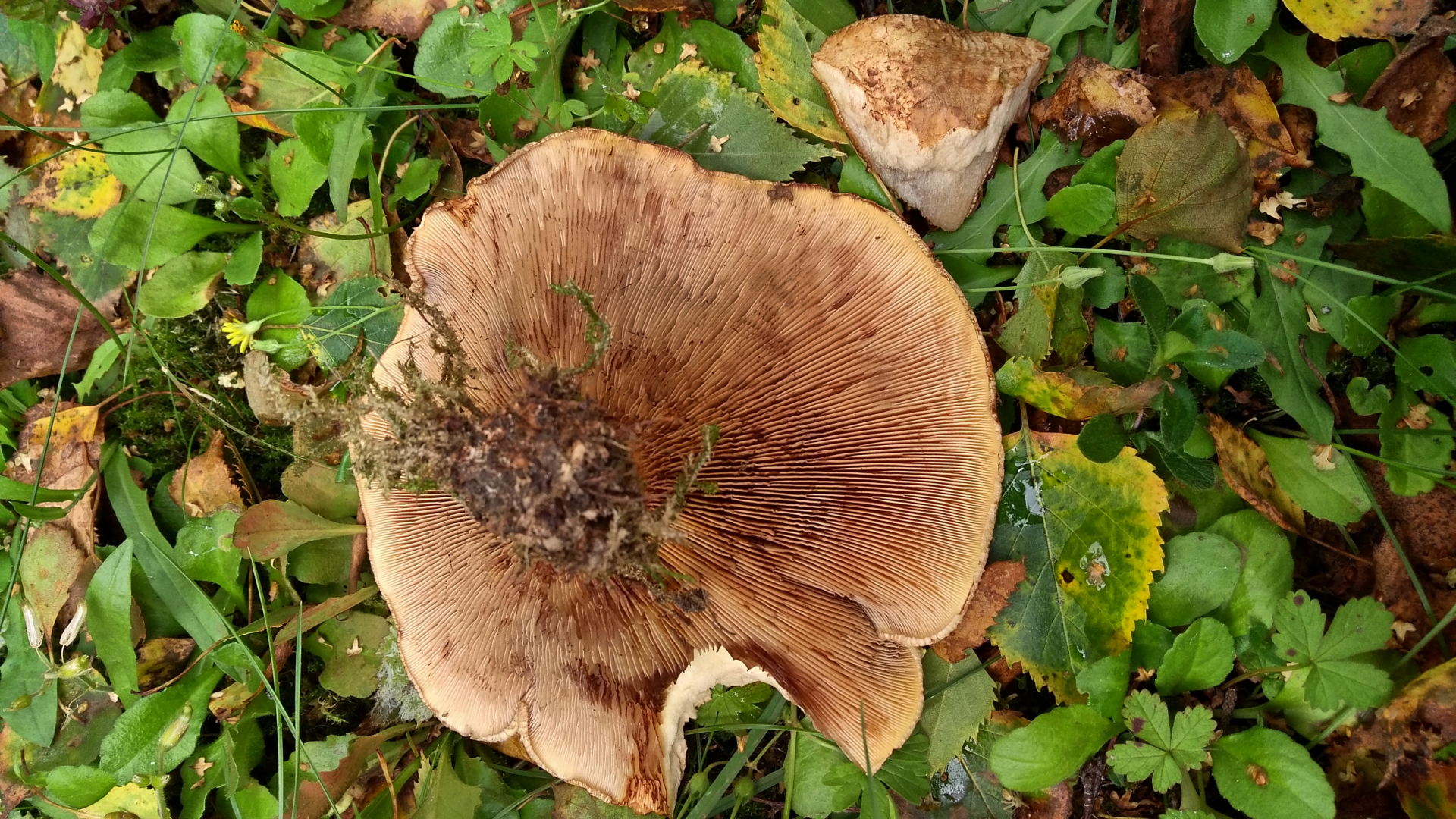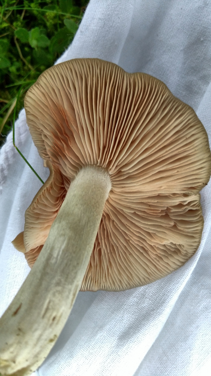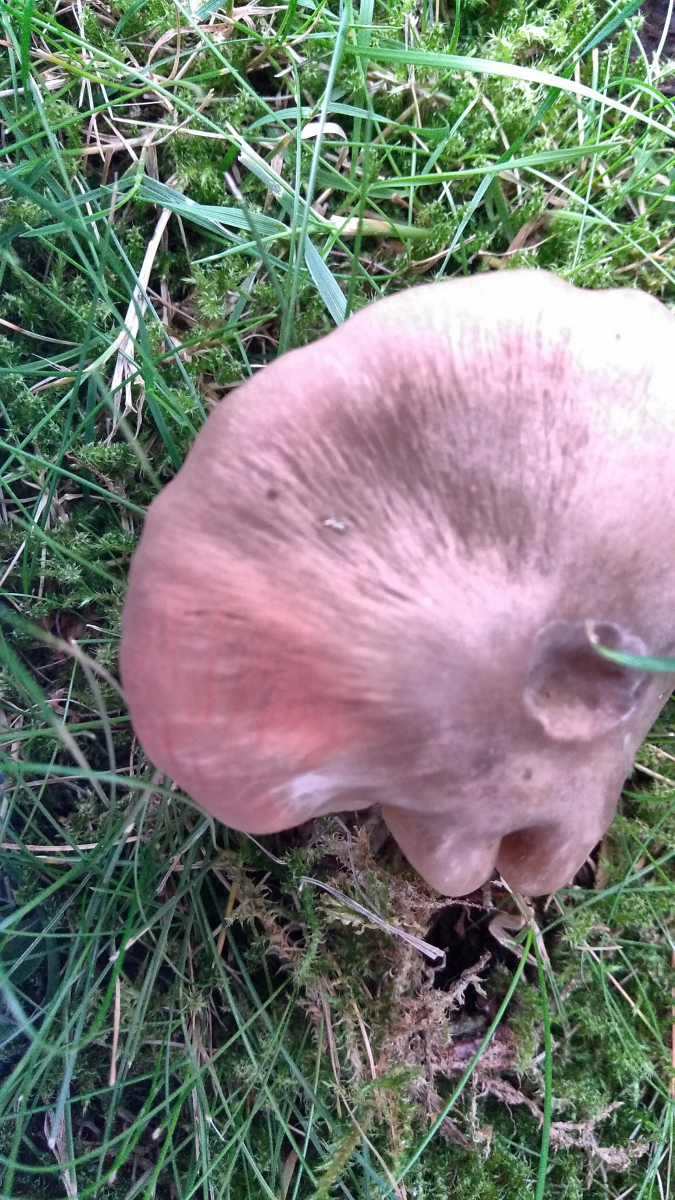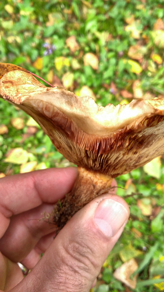 Ich dachte zunächst an einen Milchling, die eng stehenden Lamellen gaben aber nichts her und die Farbe der Lamellen passte nicht. Sie verfärbten sich aber schnell dunkelbraun an den Stellen, wo sie berührt wurden. Zu Hause fiel mir dann wieder ein, dass das ein typisches Merkmal des Kahlen Krempling ist. Der Vergleich mit Bildern meiner Bücher hielt dem stand, so dass ich jetzt glaube, dass es sich um diesen handelt.