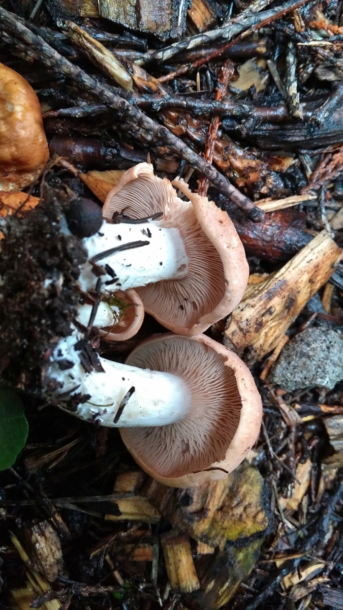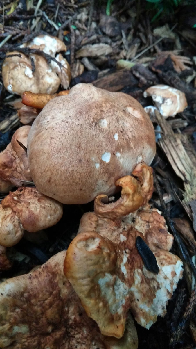ich habe heute diesen Pilz gefunden und habe überhaupt und absolut gar keine Idee, in welche Richtung ich schauen sollte. Die Fruchtkörper befinden sich in der Stadt in einer (Müll)ecke auf Rindenmulch unter strauchig gewachsenen Eiben. Den Geruch konnte ich schlecht identifizieren, weil Rindenmulch diesbezüglich doch sehr intensiv ist. Am ehesten gab es eine fruchtige Komponente. Die Hüte, trotz feuchter Witterung, trocken, fast etwas schuppig bei den jüngeren Fruchtkörpern. Der Stiel bricht faserig. Ring habe ich keinen gefunden. Ich dachte zunächst an einen Reifpilz wegen Farbe und Habitus, da fehlt aber leider der Ring.