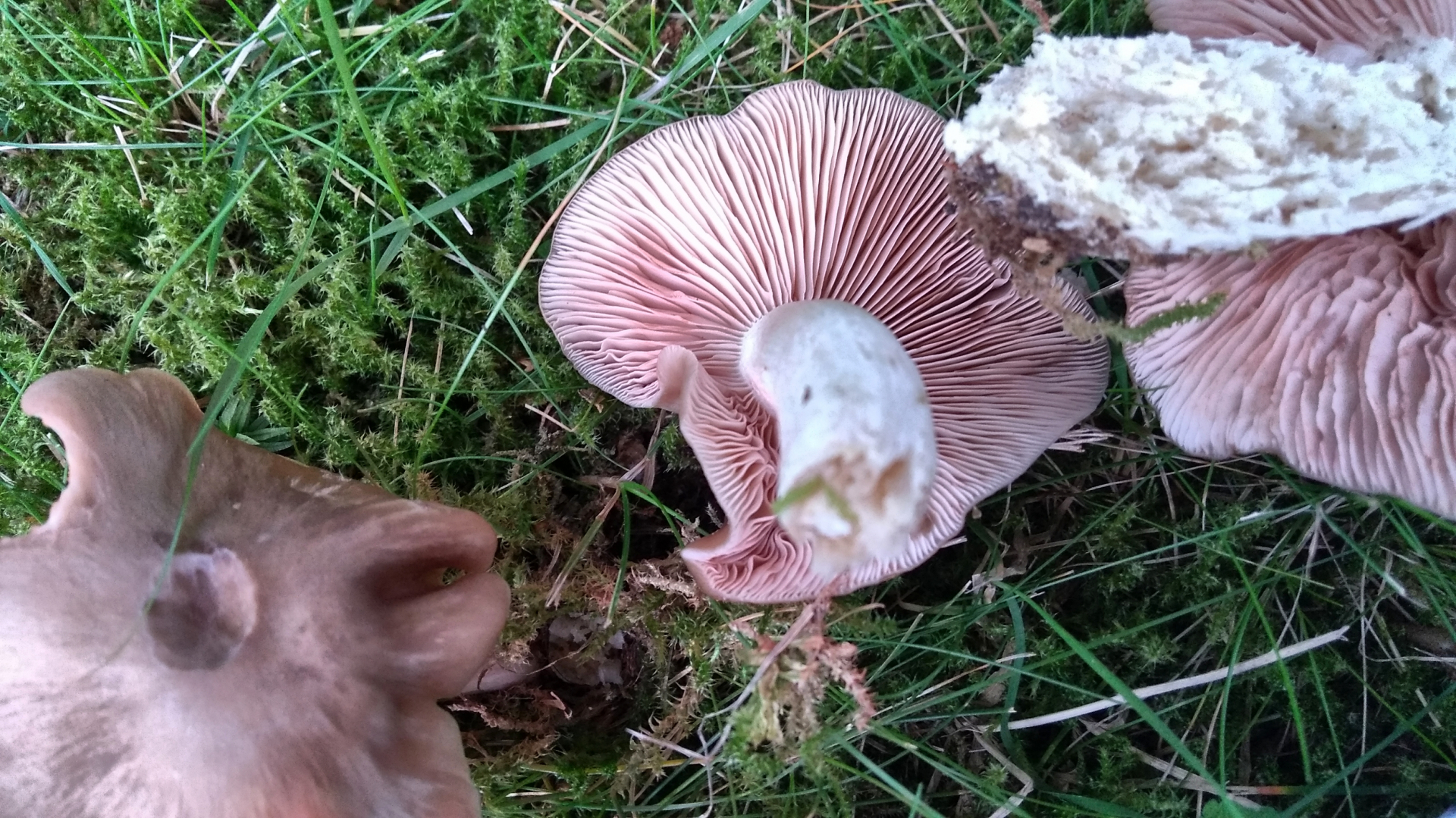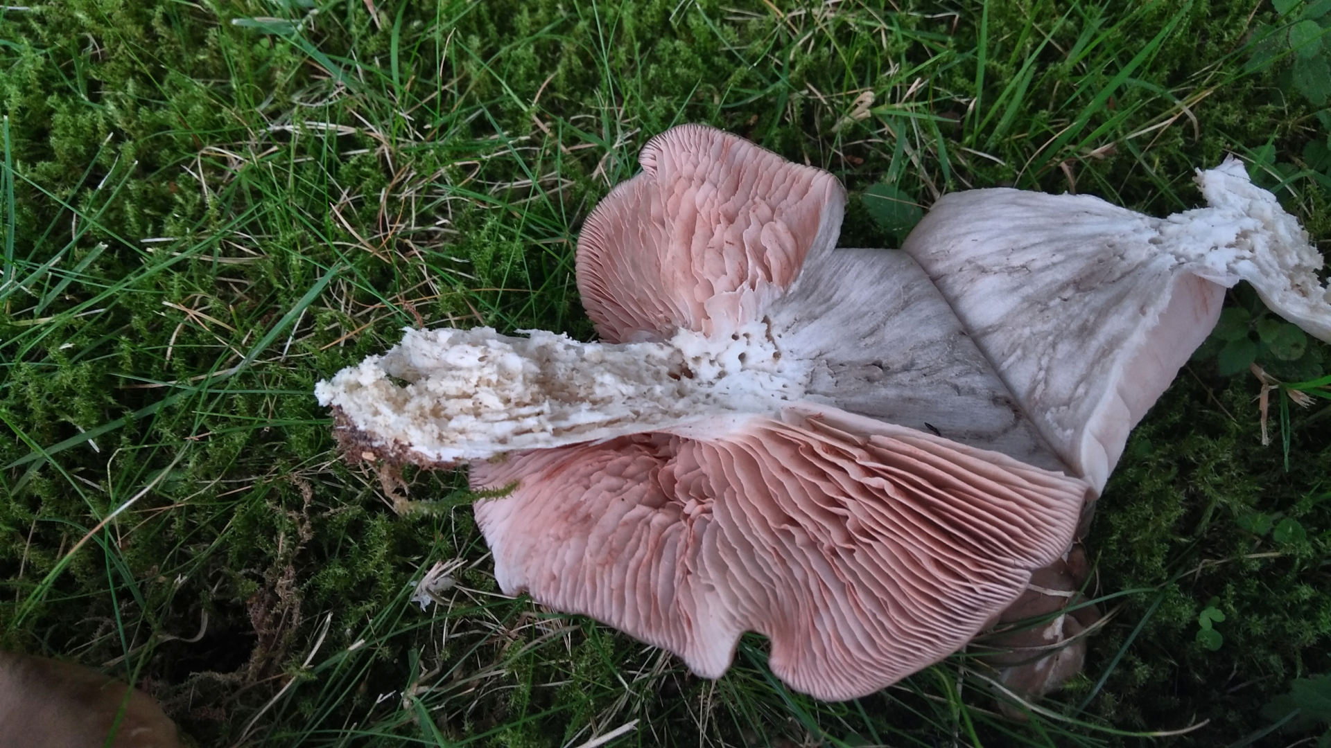 bei meinem gestrigen Friedhofsrundgang begegneten mir häufig und zum wiederholten Mal gesellig wachsende Gruppen von Fruchtkörpern, jeweils unter Eichen wachsend. Ich bin denen bislang aus den Weg gegangen, weil die für mich auch jung irgendwie immer leicht überständig schienen. Das Fruchtfleisch ist weich, ebenso die Lamellen. Diese sind recht eng stehenden und gegabelt. Der Stiel sehr faserig, was aber auch dem heftigen Madenfraß geschuldet sein kann. Die Sporen scheinen eindeutig rosafarben zu sein, es gibt einen deutlichen Abdruck auf dem Kollegen. Auch an rosa gefärbten Stellen auf den Lamellen wird das sichtbar. Leider habe ich verpasst einen vernünftigen Längsschnitt zu machen, so wird nicht deutlich, ob die Lamellen freistehend oder ausgebuchtet oder angewachsen sind. Die Fotos auf denen der weiße Beutel mit abgebildet ist, entsprechen den realen Farben (mein Smartphone kann keinen vernünftigen Weißabgleich).