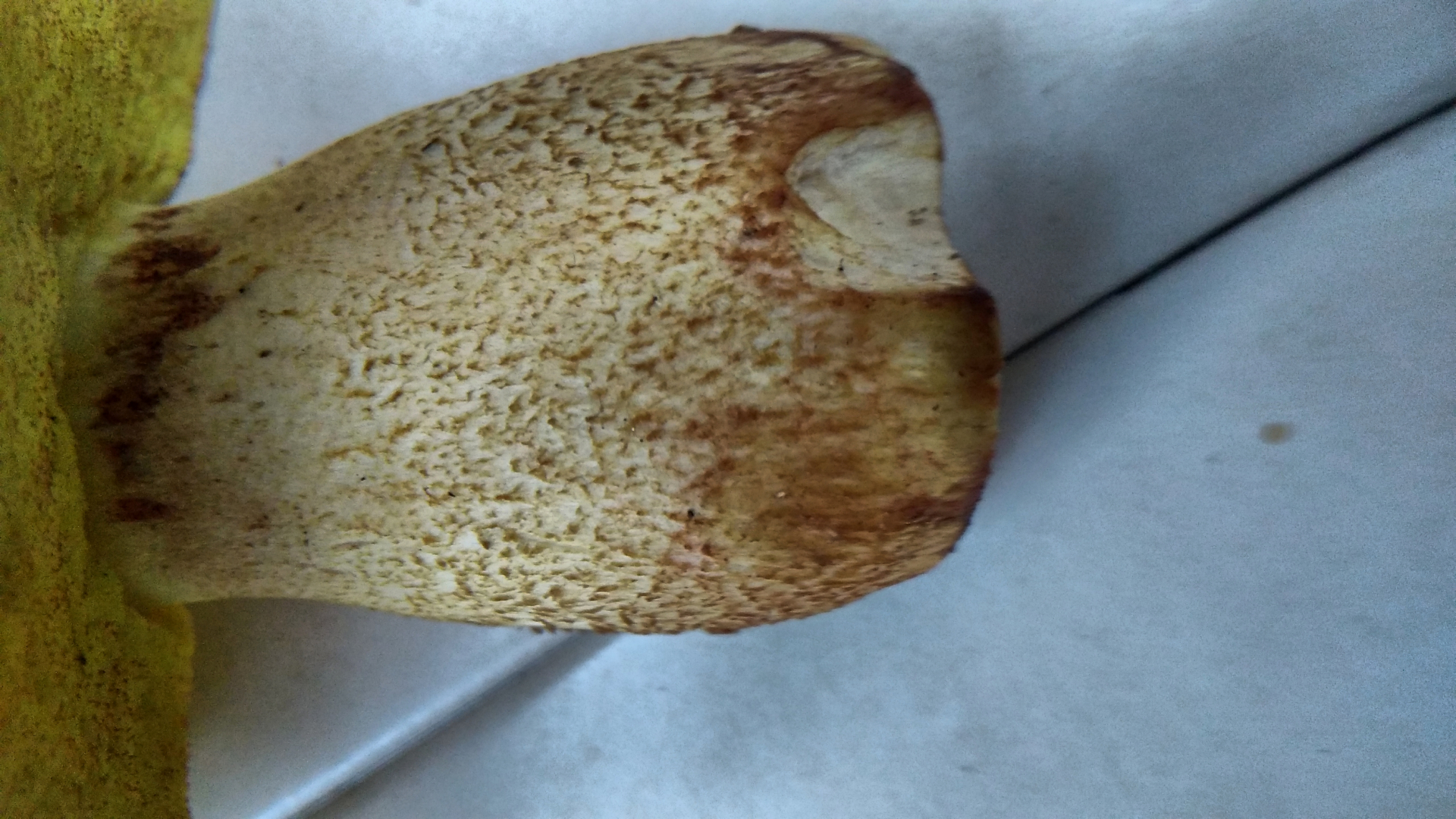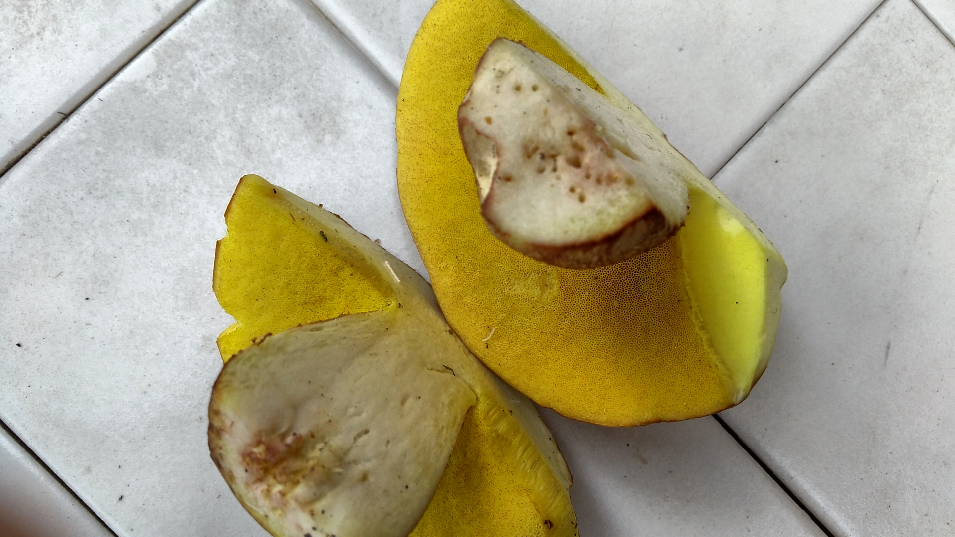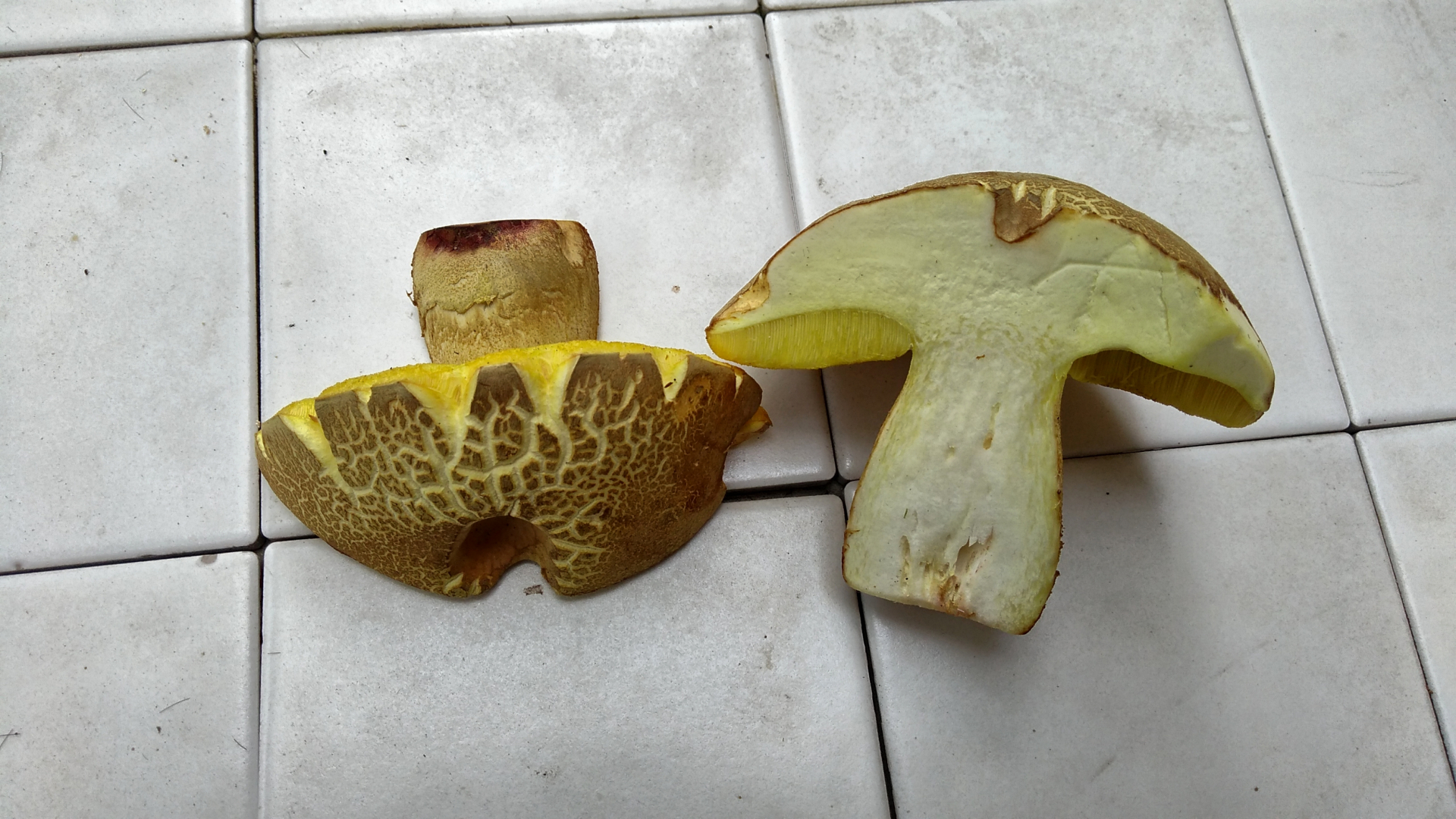 Hutfleisch zitronengelb, Geschmack vielleicht leicht säuerlich, fruchtig, Geruch leicht pilzig mit einem Hauch Karbol, kaum Verfärbung beim Schnitt, wenige Maden, festes Fruchtfleisch, Poren fast so fein wie beim Steinpilz, Stielnetz allenfalls zu erahnen, eher wie beim Flocki... Anhängsel Röhrling (Butyriboletus appendiculatus)? Aber der braucht doch Eichen? An der selben Stelle fand ich vor einigen Tagen Flockis, die es ja bekanntlich sauer lieben.
