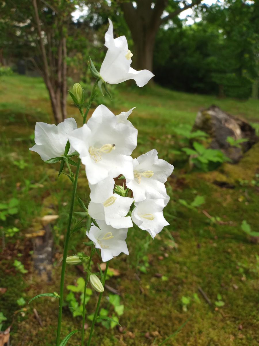 Wegen der ausgesprochen hübschen Blüte und weil sie weiß, statt blau ist: Pfirsichblättrige Glockenblume (Campanula persicifolia)