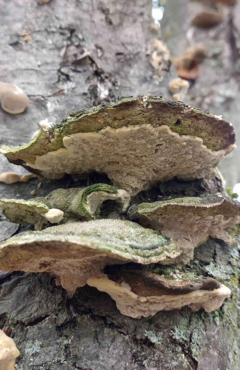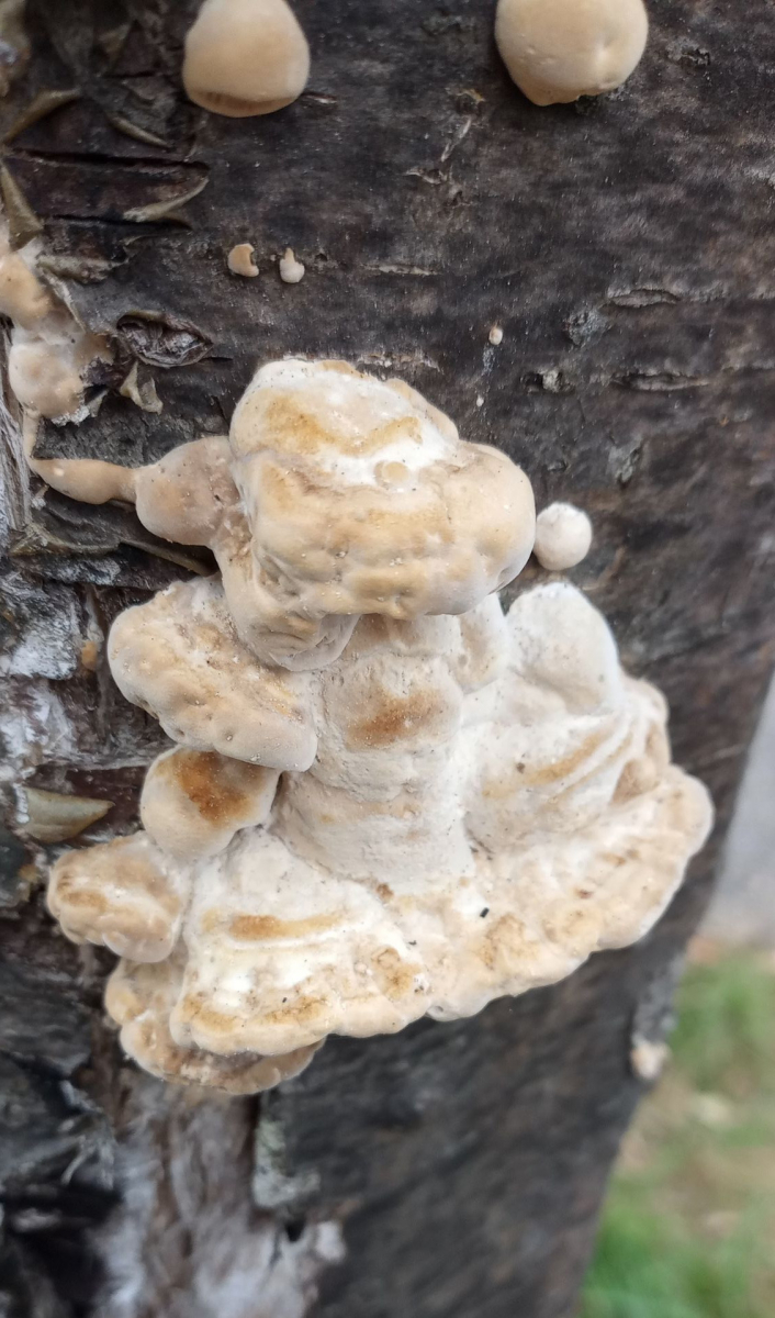 mein Fahrrad-Weg zur Arbeit ist gesäumt von arg (trocken?)geschädigten Schwedischen Mehlbeeren. Ich hatte letztens schon eine Bestimmungsanfrage zu einem Pilz daran gestellt. Der vermutete Feuerschwamm stellte sich als Striegelige Tramete (T. hirsuta) heraus. Weiter oben am Stamm fand ich gestern ältere Fruchtkörper, die für mich etwas typischer geformt sind: