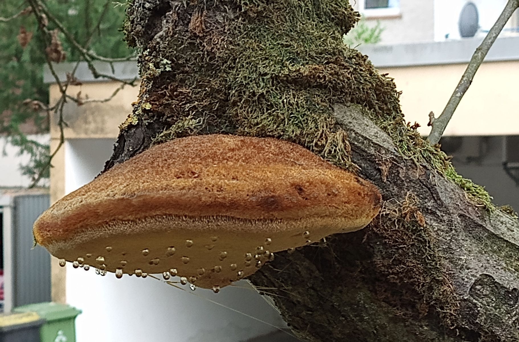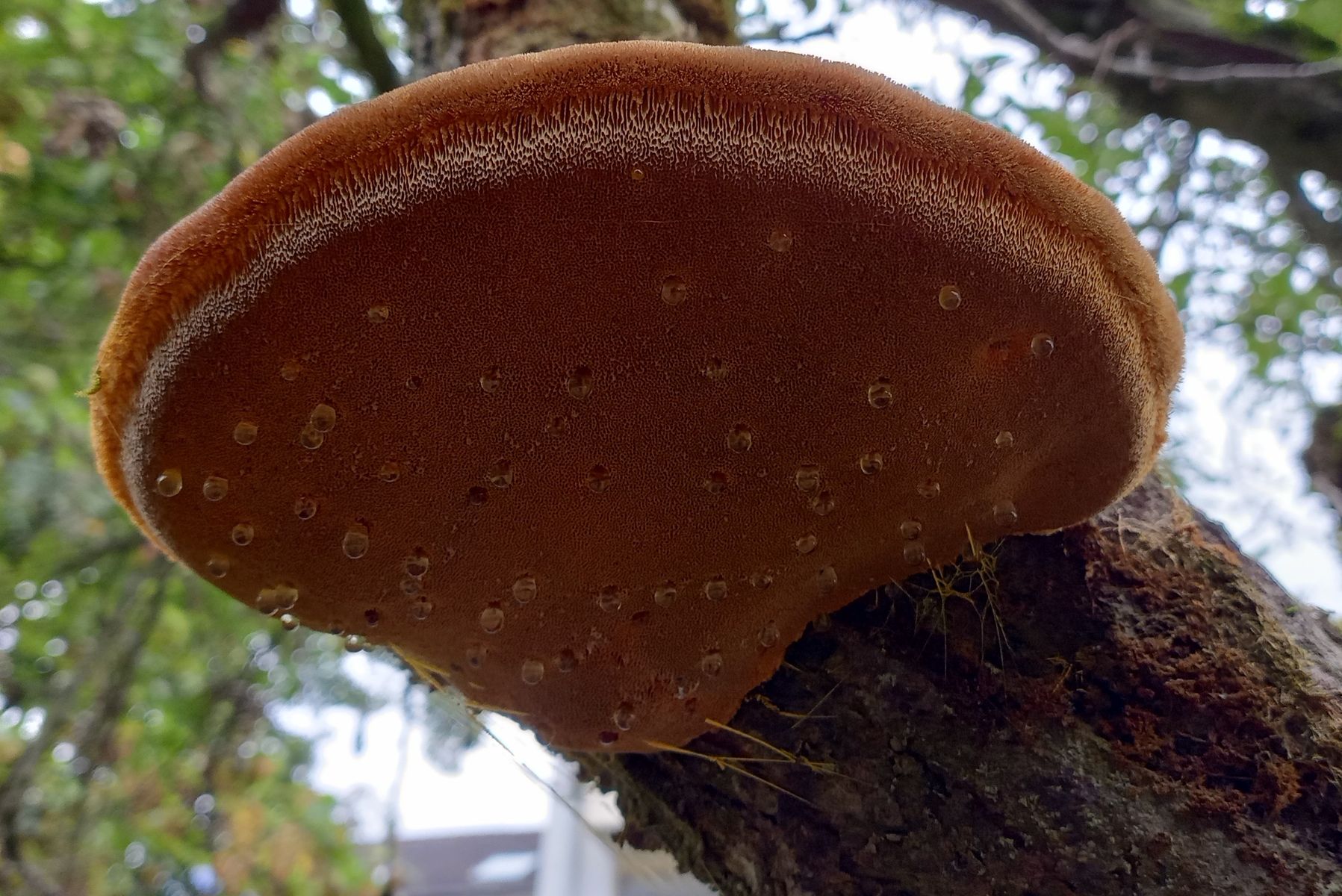 Besonderes freue ich mich über diesen Pilz, der in der gleichen Reihe, allerdings an einem Apfelbaum wächst. Gestern hat er wegen des starken Regens in der Nacht zuvor Guttationstropfen gebildet. Ein einziger Fruchtkörper, den ich ausgesprochen hübsch finde. Schwierig zu fotografieren, weil er so hoch hängt, aber sehr kuschelig.