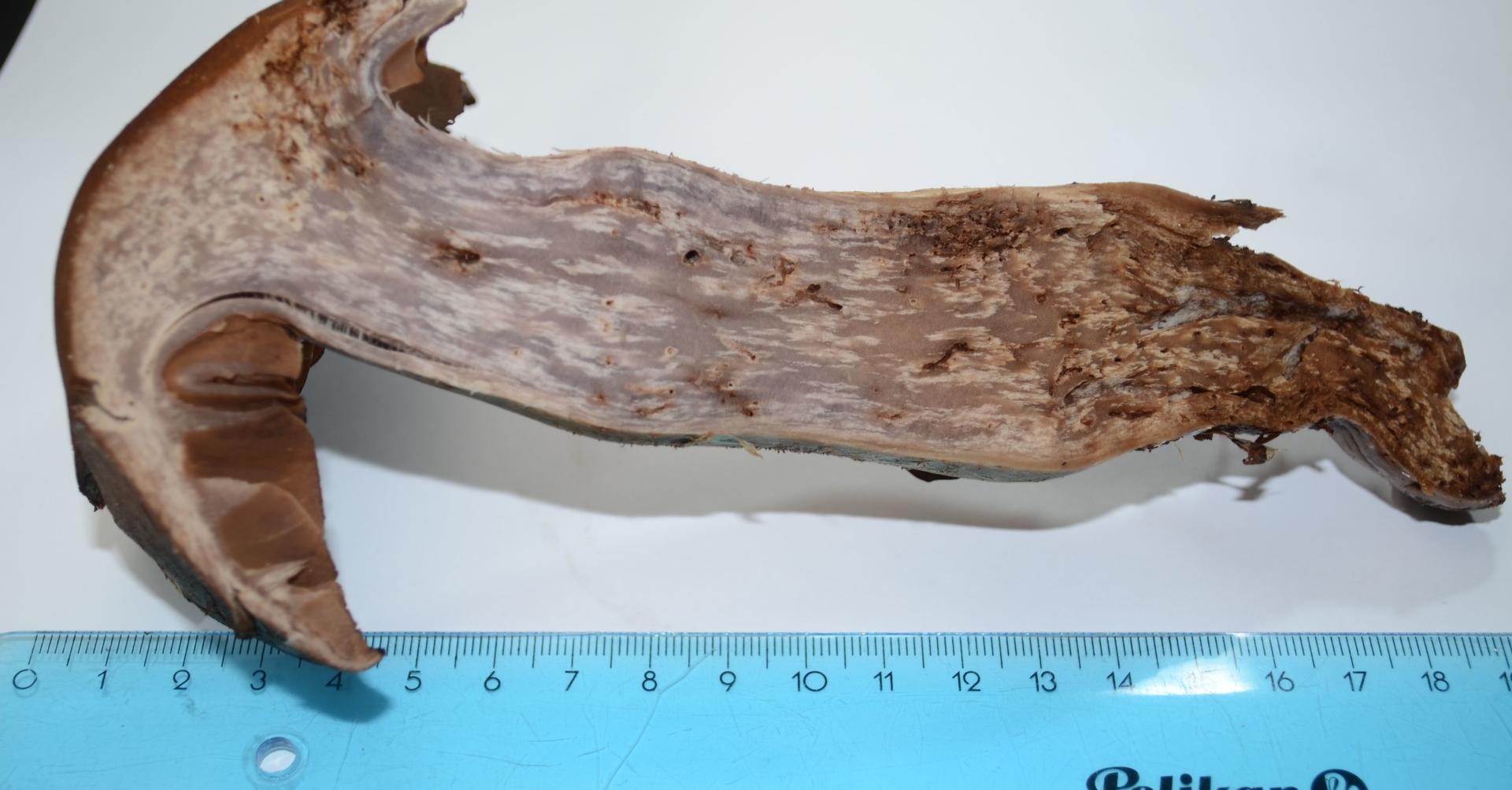 Fruchtkörper : dickfleischig, robust, Hutdurchmesser 15cm, Stiellänge 15cm, hart, zäh, trocken