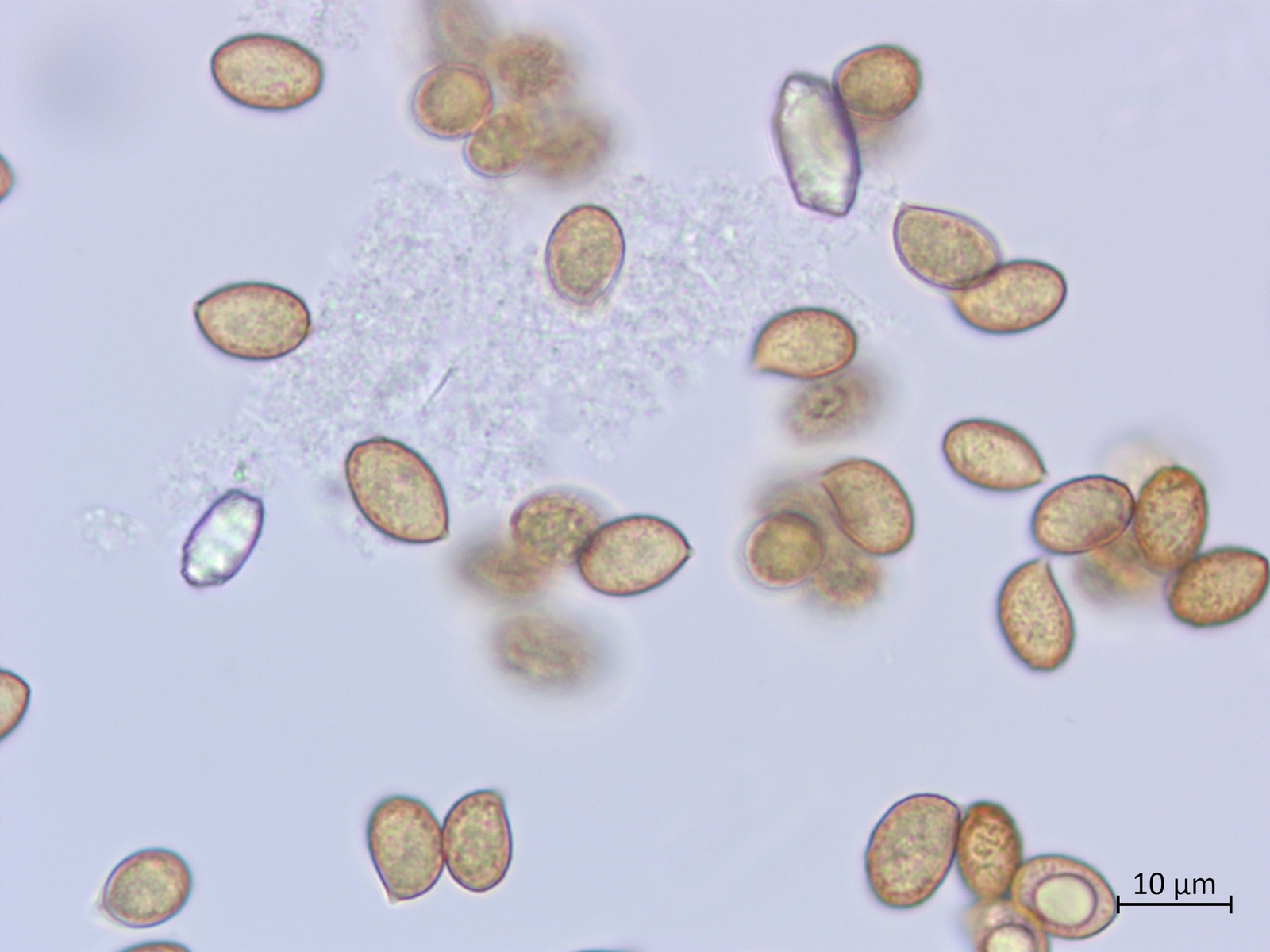 Sporenmasse: 8.9 - 11.5 x 5.5 - 7.0 μm - Q: 1.44 - 1.82 μm (Ø LxB: 10.1 x 6.4 μm ØQ:1.6 μm AzM: 27)