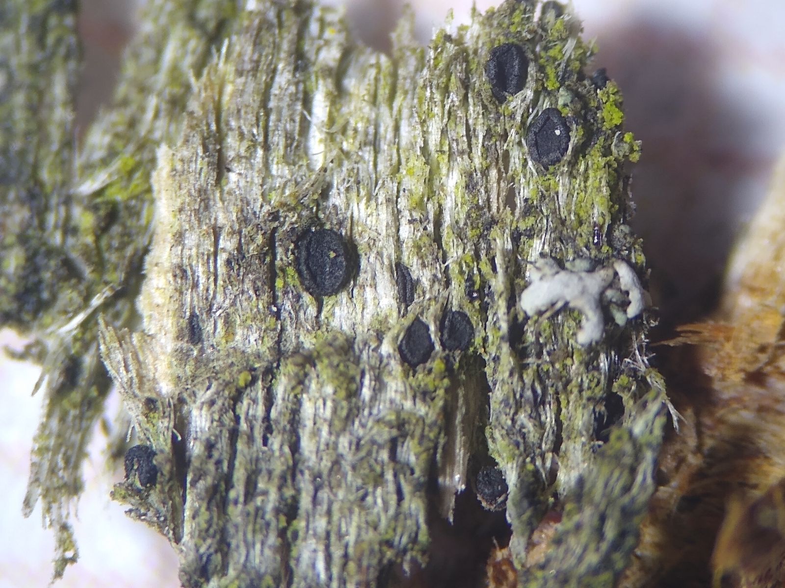 Sie sind kein Aufwuchs, sondern gehören zum Flechtenthallus, wie die sie umgebenden, weißen Hyphen erkennen lassen.