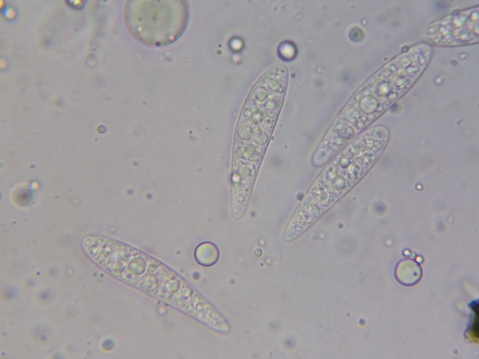 Bild 5 Hymenium gequetscht in Wasser: Asci dünnwandig, zylindrisch, 8-sporig mit sehr kleiner Okularkammer.