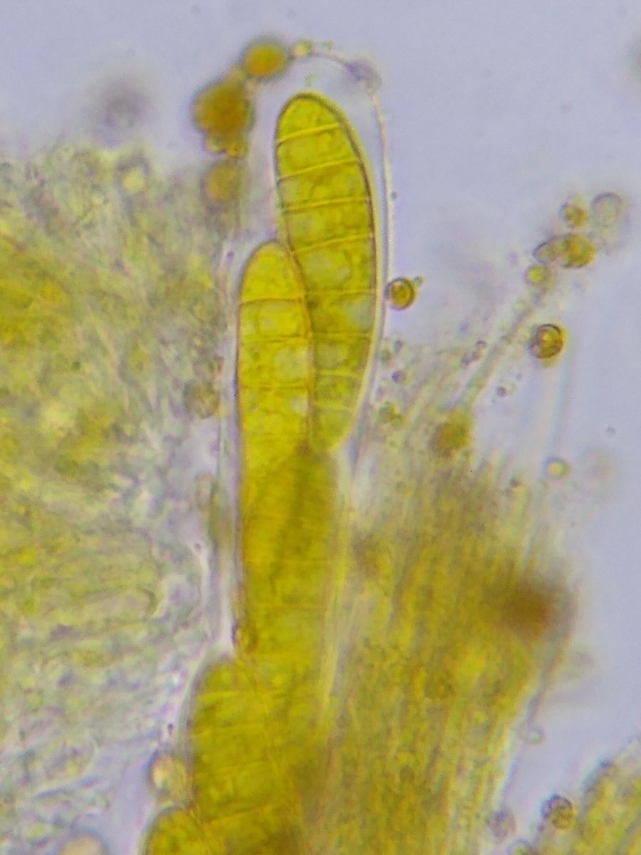 Die Sporen sind schlank tropfenförmig, 10-zellig, querseptiert. Sie messen 34-39 x 7-8 µm².