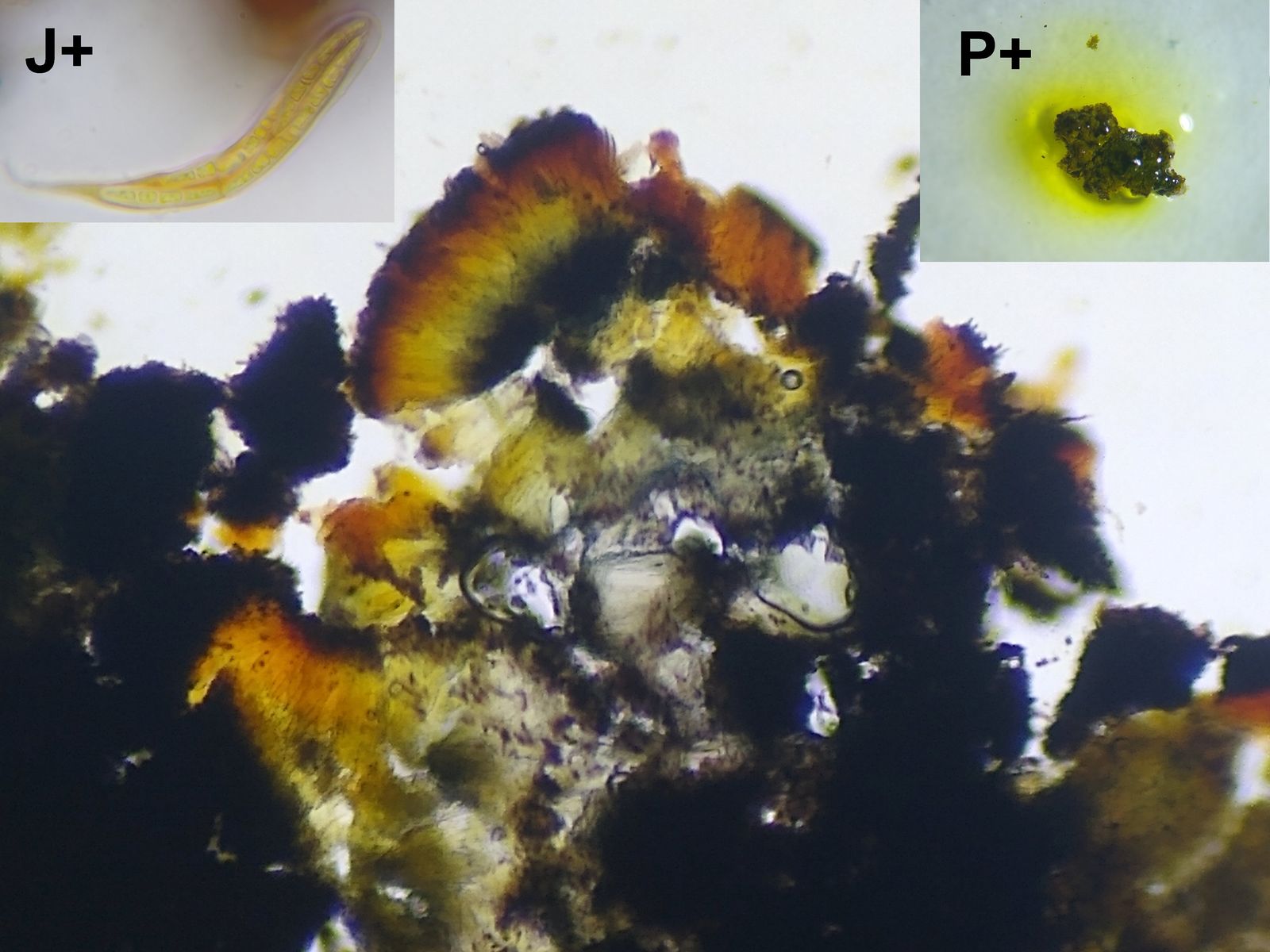 Bild 6 Farbreaktionen: Hymenium J+ orange-rot, Thallus P+ gelb-orange