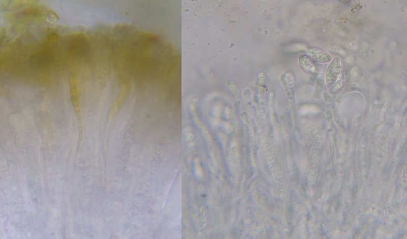 Das Hymenium und Hypothecium erscheinen im Querschnitt in dicken Schichten orangebraun, das Hypothecium fluoresziert in UV türkis..