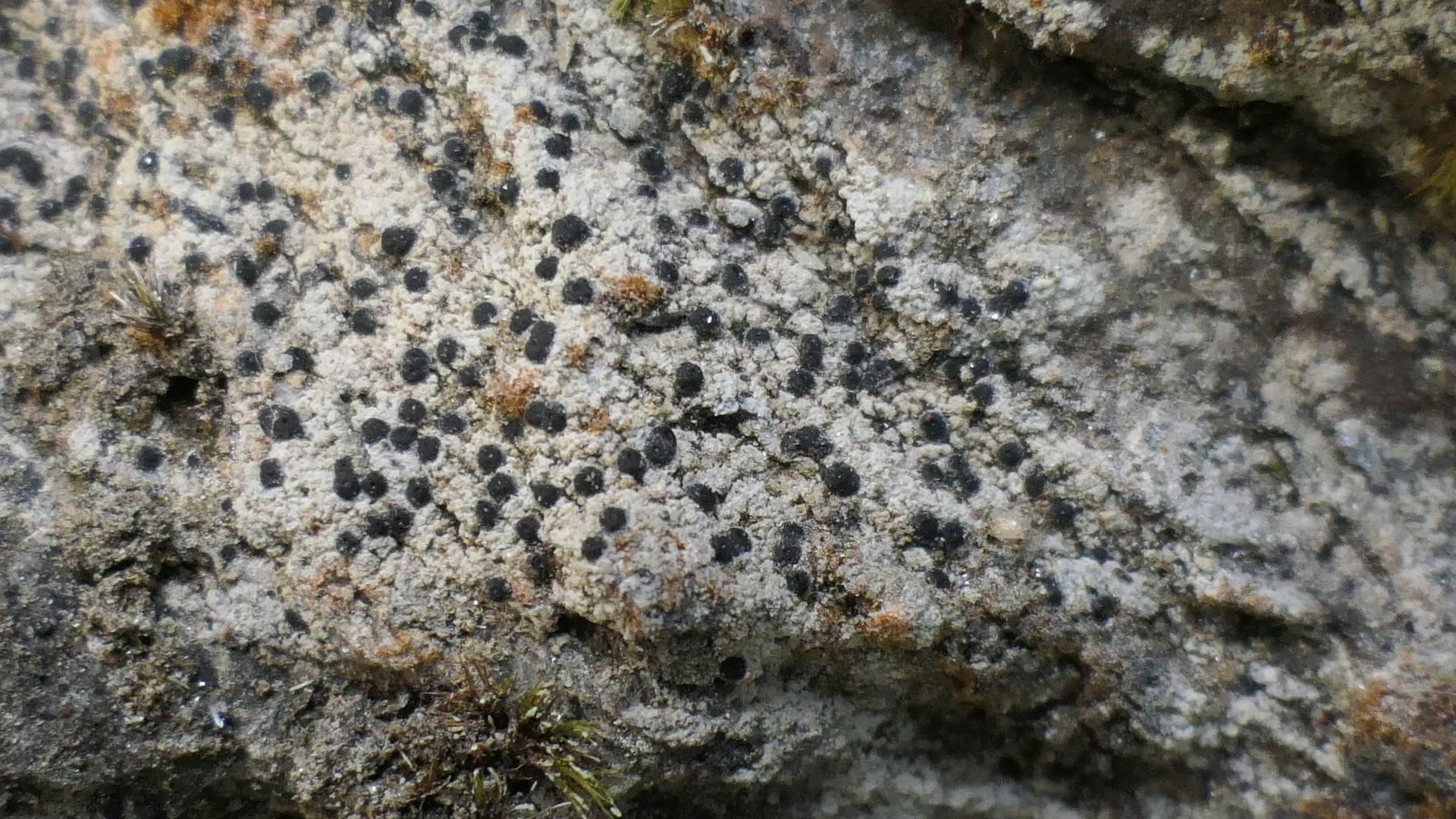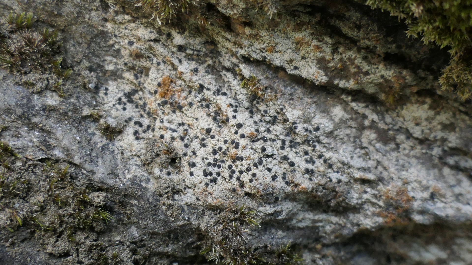 Ein kleines Stückchen weiter erkenne ich auf etwas warzigen Untergrund kleine, schwärzliche Apothecien.