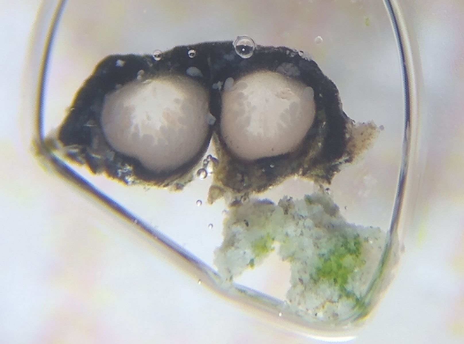 Dunkle Septen bei Paraphysen und Sporen kenne ich so nicht, ansonsten schein alles (inkl. Algenzellen) zu der Flechte Catillaria nigroclavata zu passen.
