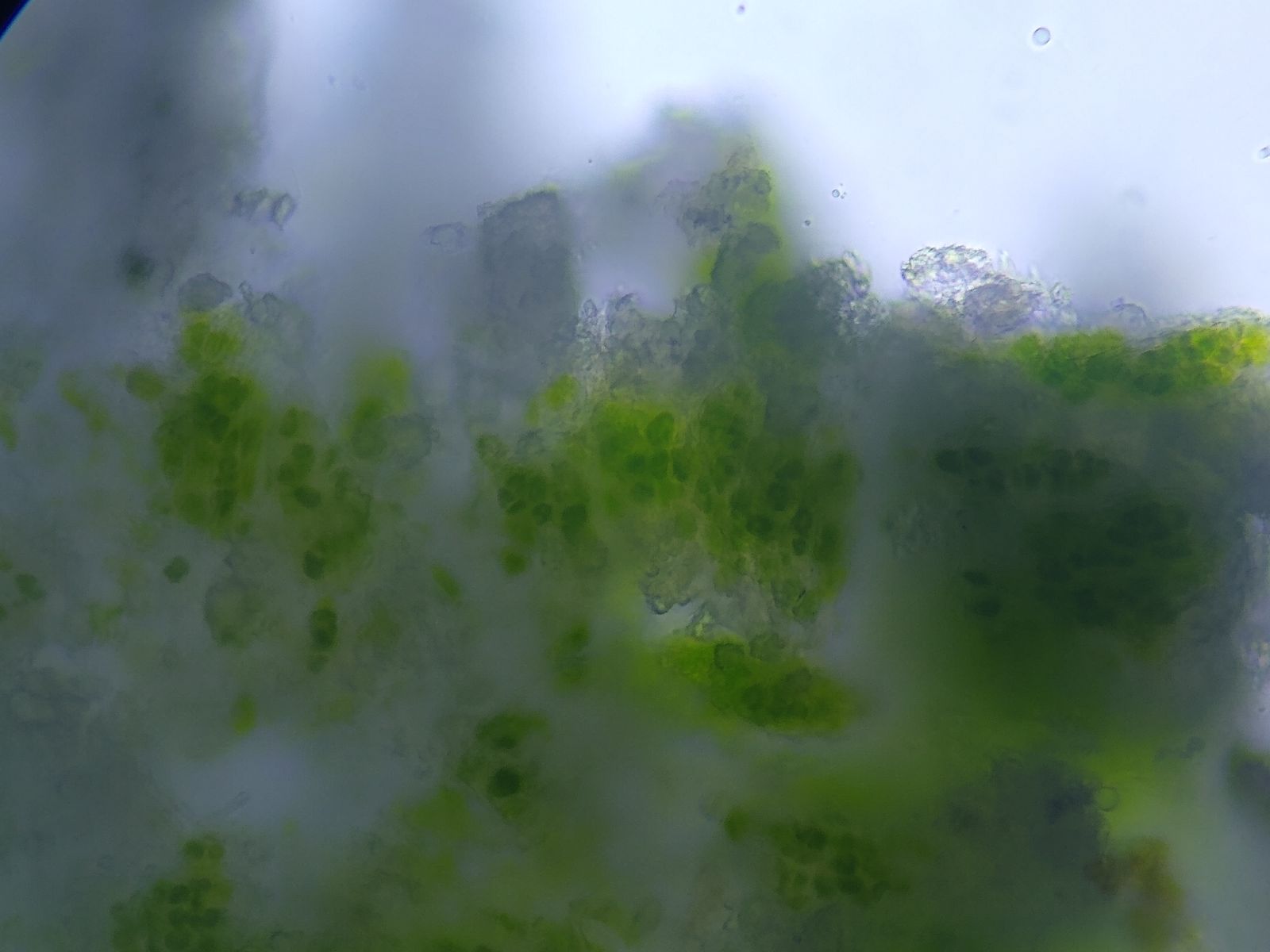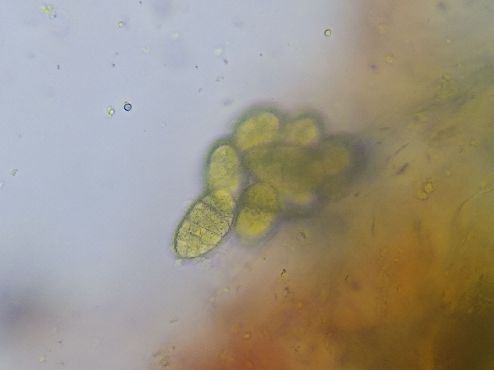 Bild 11 Die Algen haben eine Größe von etwa 10 µm. Zwischen ihnen und an ihnen anhaftend sind längliche, hyaline Strukturen, in denen ich Pilzhyphen erkennen möchte. Diese Hyphenbruchstücke sind dünn (<=1 µm) und ihre Menge gering.