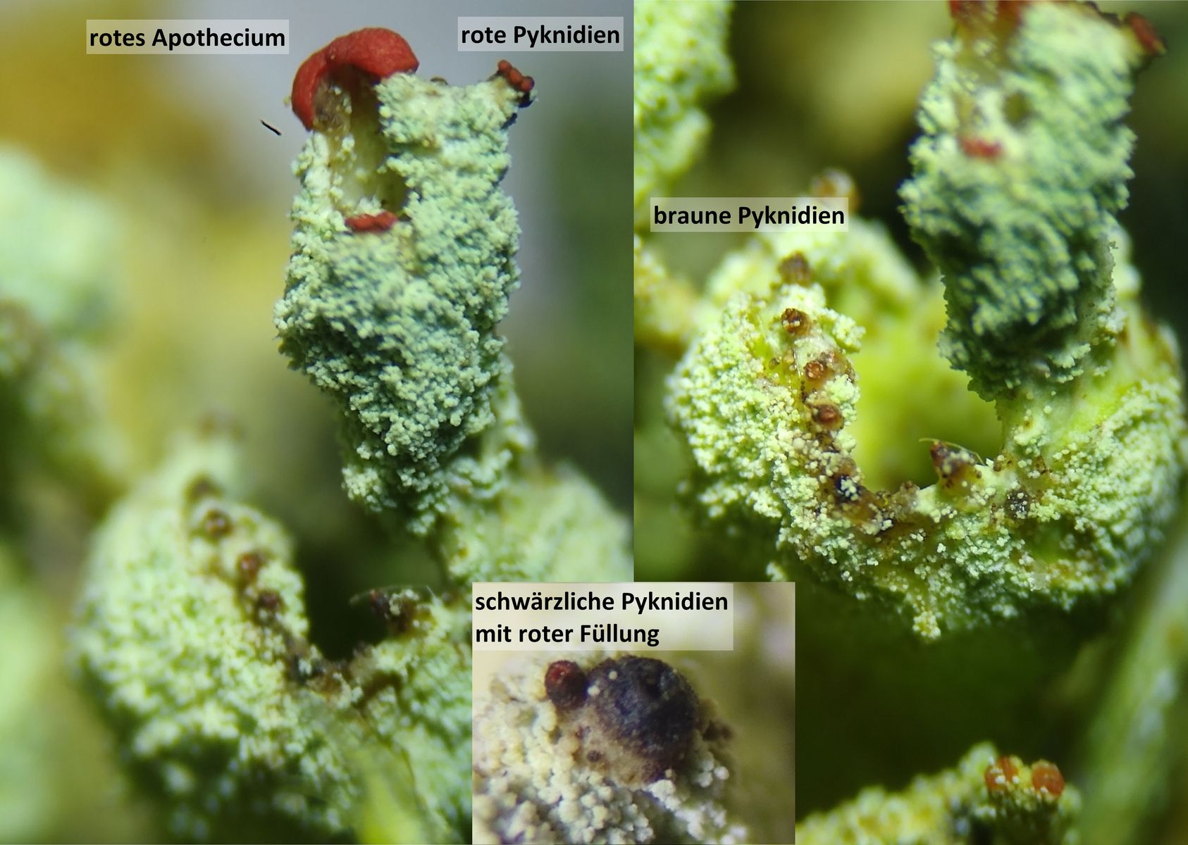 Auch der Fund in den Vogesen zeigt bei genauer Betrachtung eine rötliche Füllung der schwärzlichen Pyknidien, berindete Becherböden und Podetienbasen.