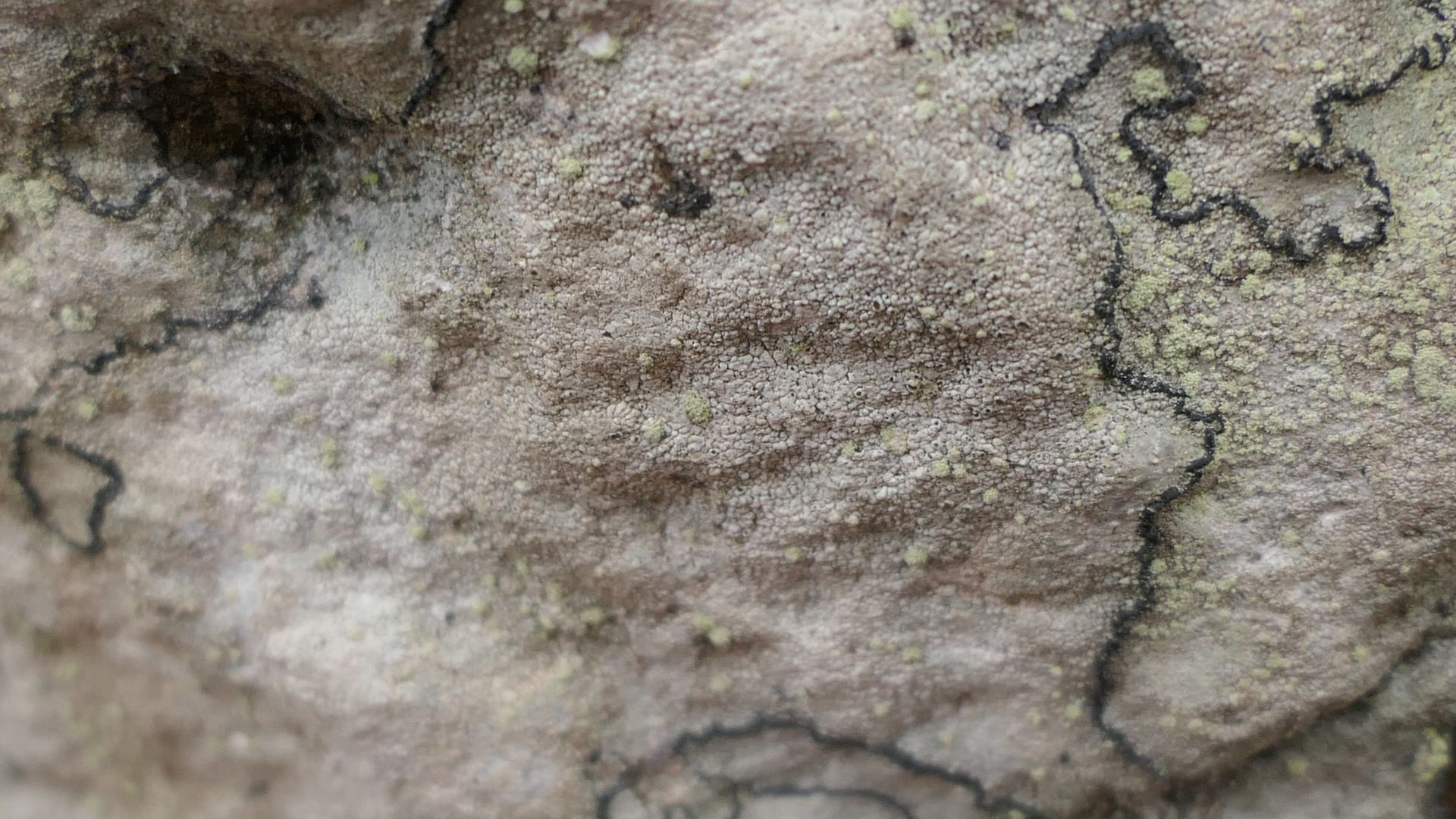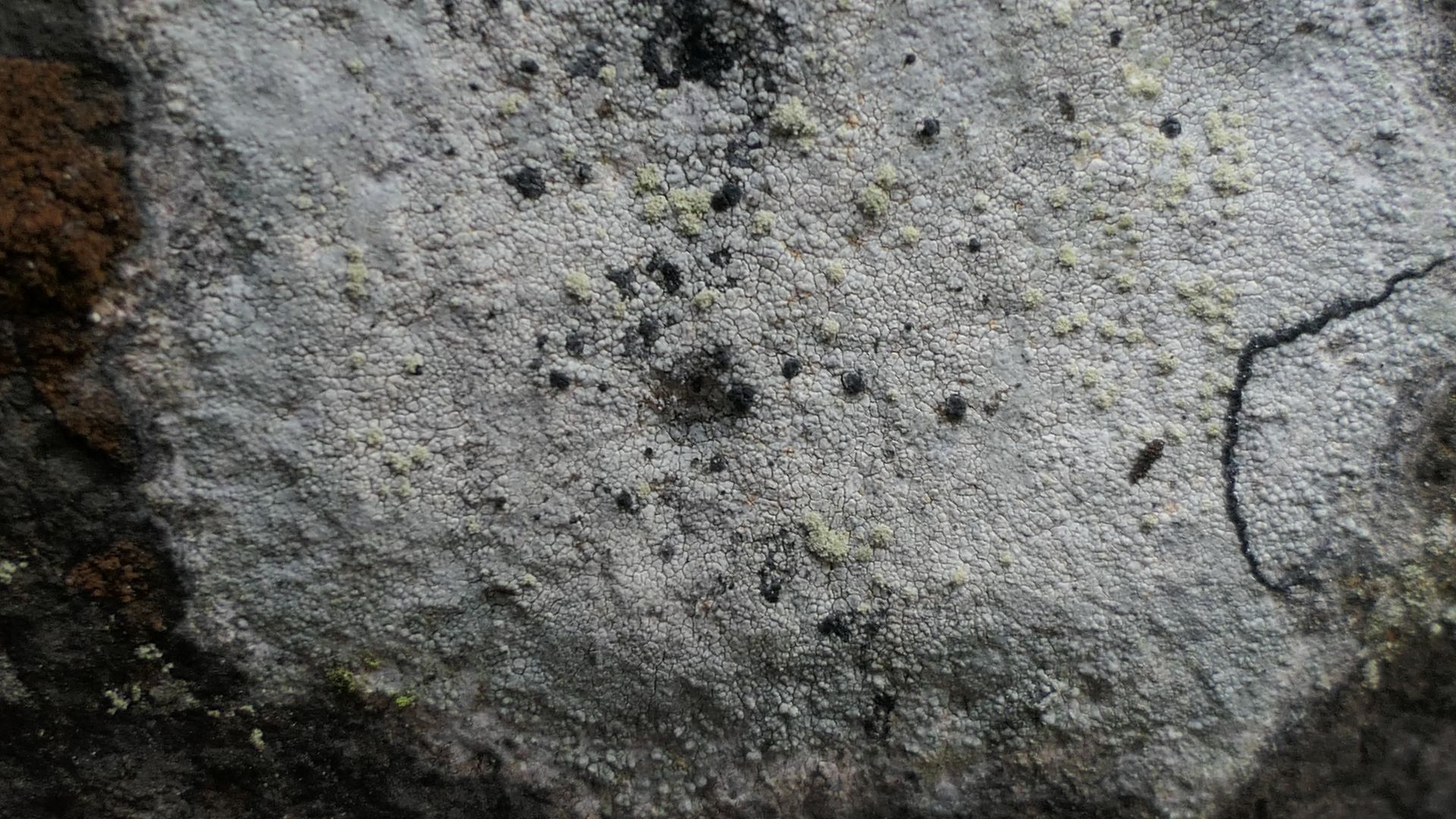Bild 4 Die Flechte überwächst andere helle Krustenflechten. Der Thallus ist dick. Zahlreiche kleine, schwarze Apothecien sind zu erkennen. Hier wird eine kleine Probe abgekratzt und zur Analyse mitgenommen.