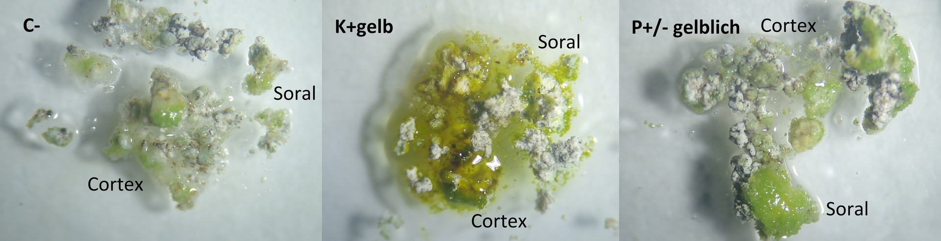 Durch die Thamnolsäure reagieren die Podetien P+orange und sollten K+gelb reagieren. Daher ist K+dunkelrot/braun (Bild V7/C9 oben) irritierend.