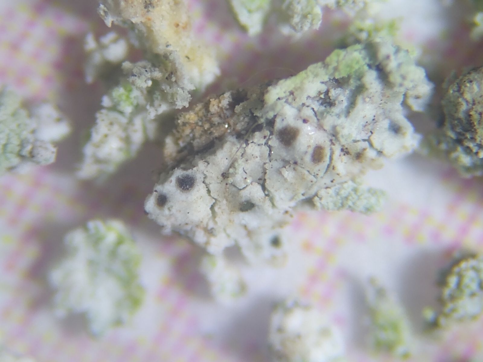 Eine weißliche bis bräunliche Kruste mit gelb-grünlichen, halbkugeligen Soralen und eingesenkten und dunklen, eingesenkten Pyknidien sollte eine Lecanora sein.