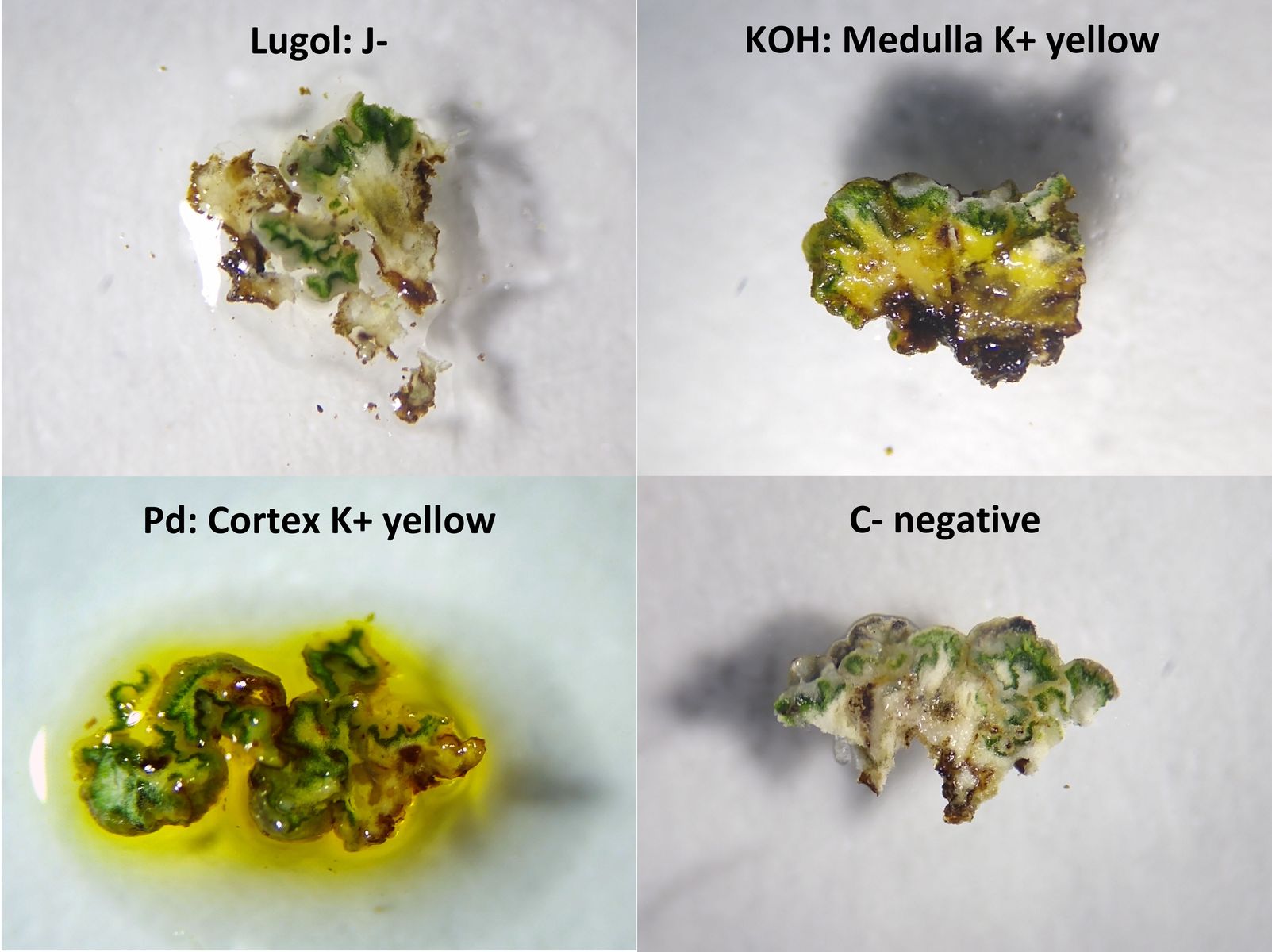 Bild 15 Farbreaktionen der Flechte an dünnen Scheiben auf Glas über weißem Papier.