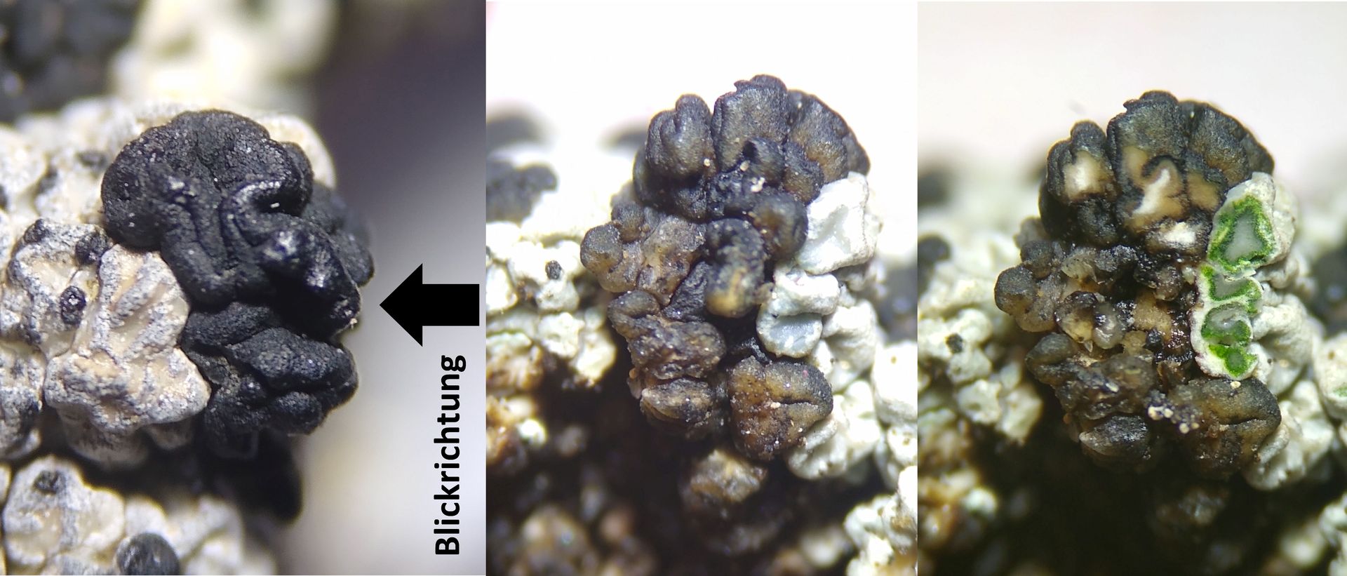 Links: Aufsicht auf den trockenen Thallus mit schwarzen Apothecien