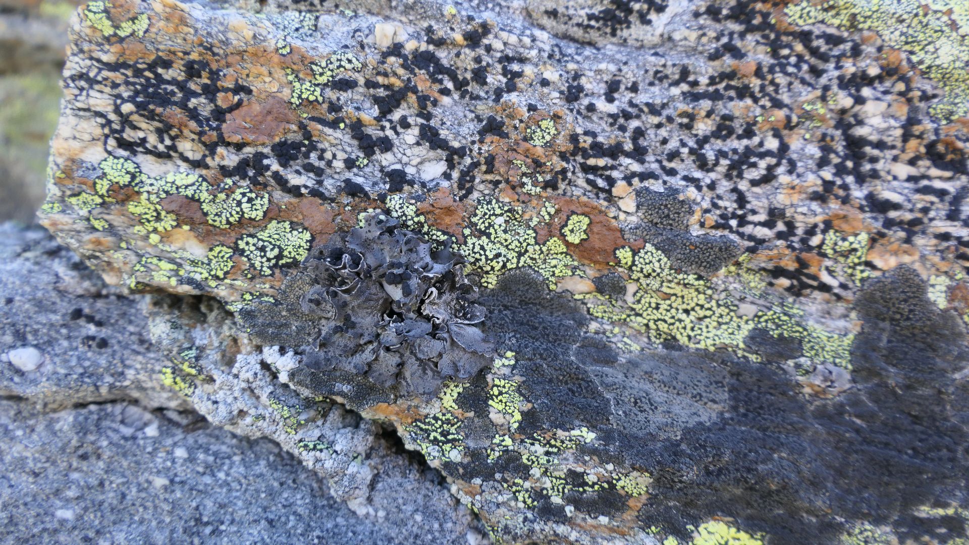 Die strauchige, dunkelbraune Pseudephebe minuscula kommt hier vor, natürlich dürfen diverse gelbe Landkartenflechtenarte nicht fehlen. Die Landkarten bestimmen über große Bereiche die Grundfarbe der Flechtenmosaike.