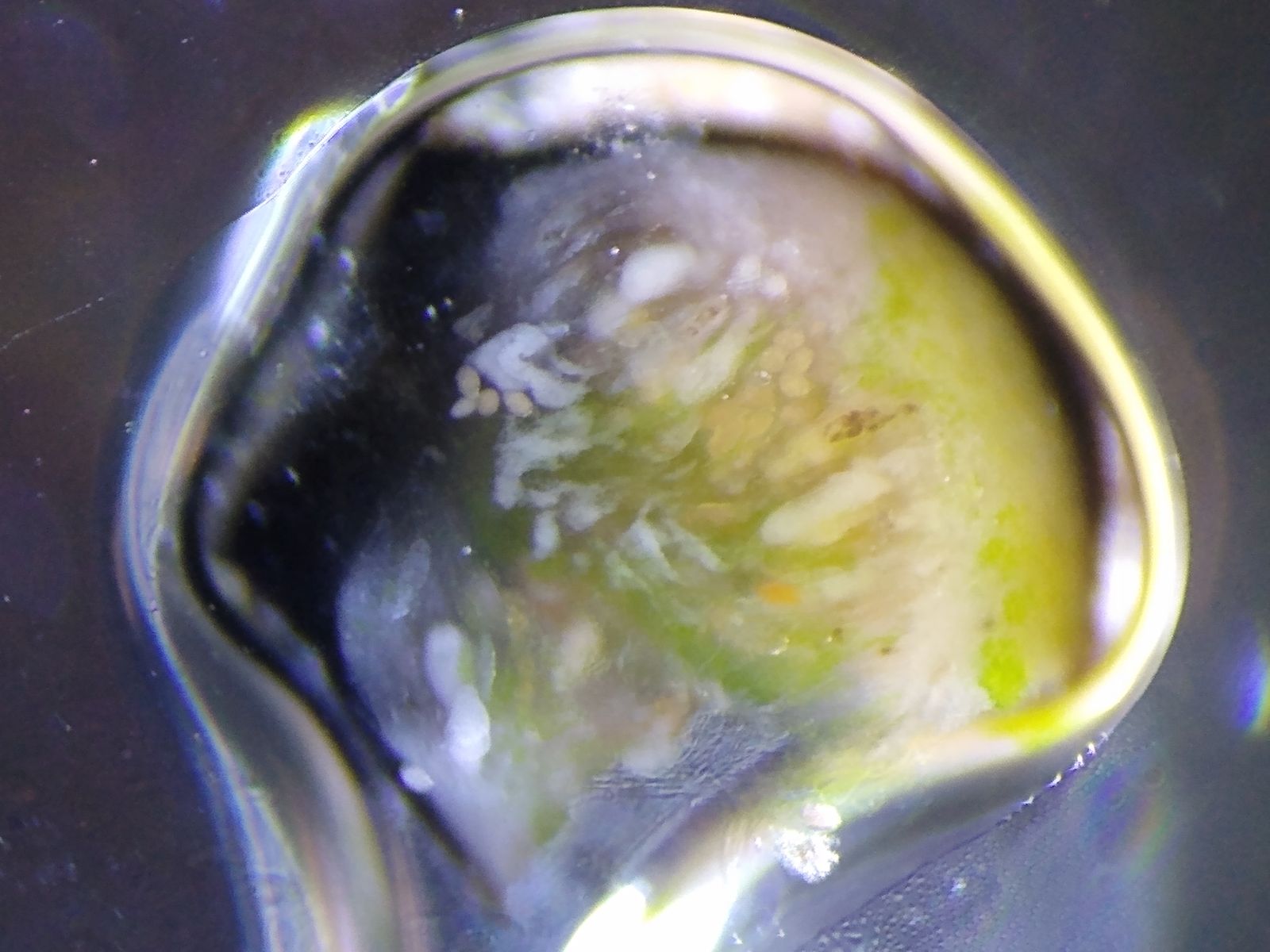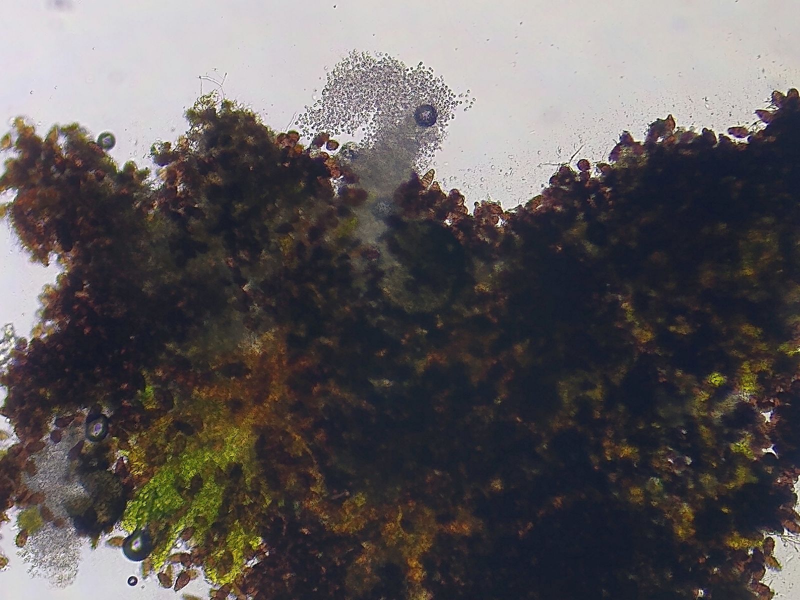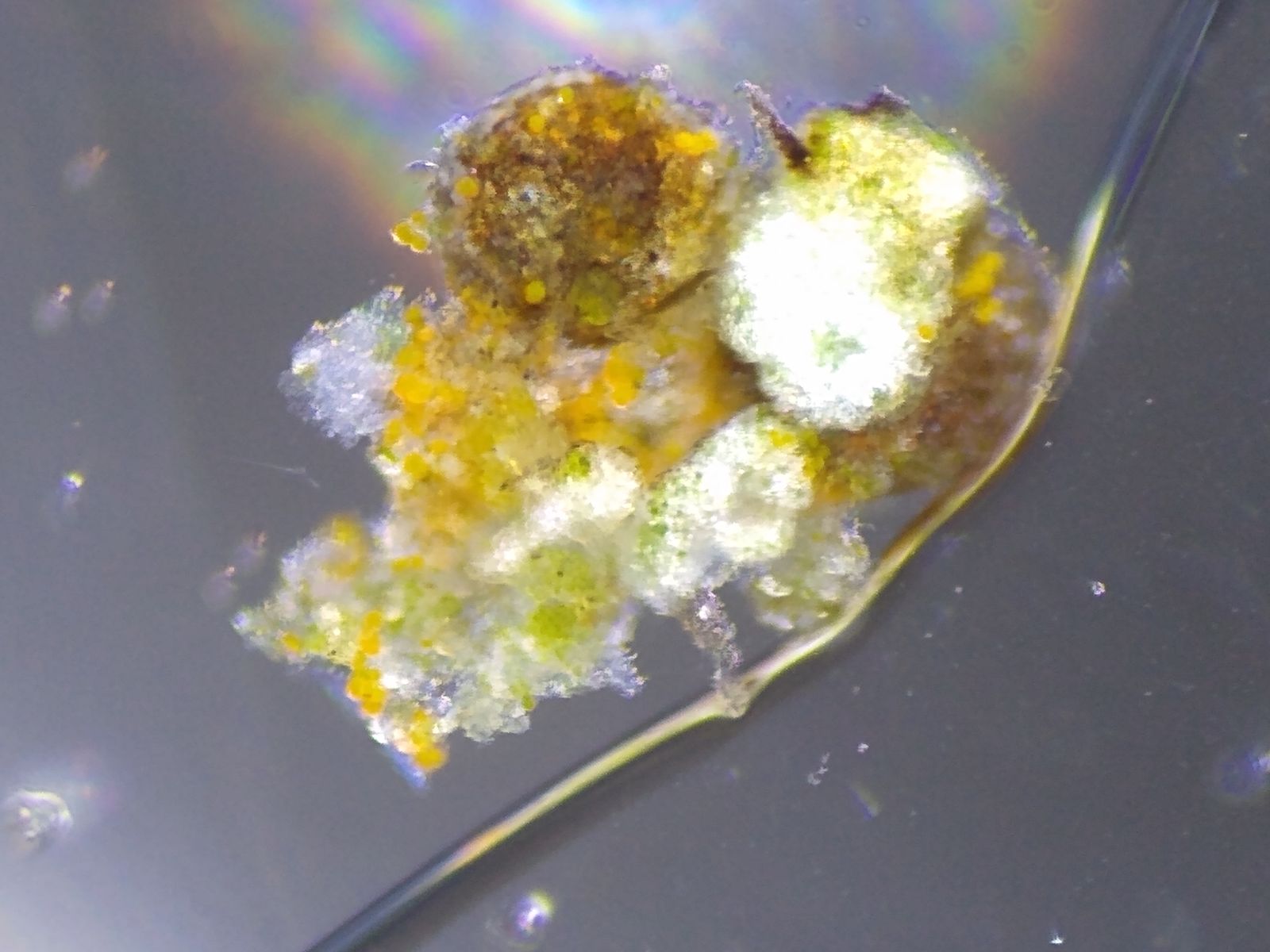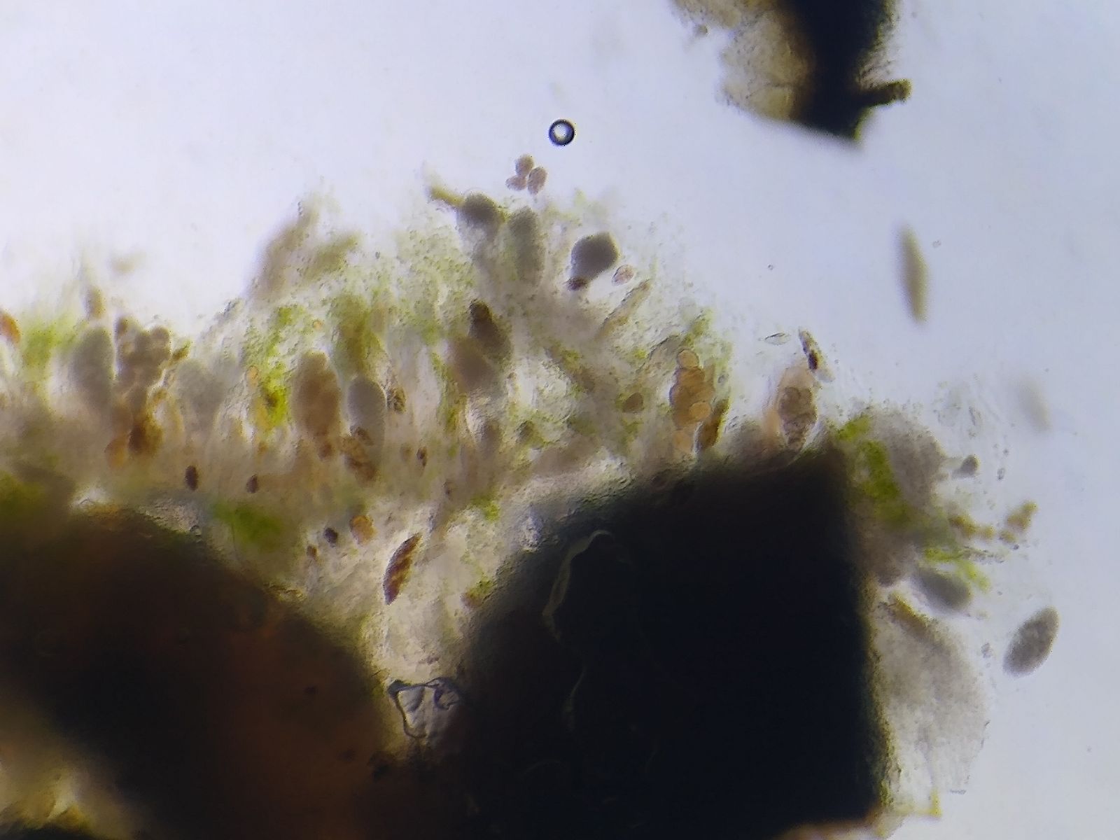 Bild 5 Getrocknete Probe nach KOH-Tüpfeltest auf einem Apothecium (negativ, 30% KOH)