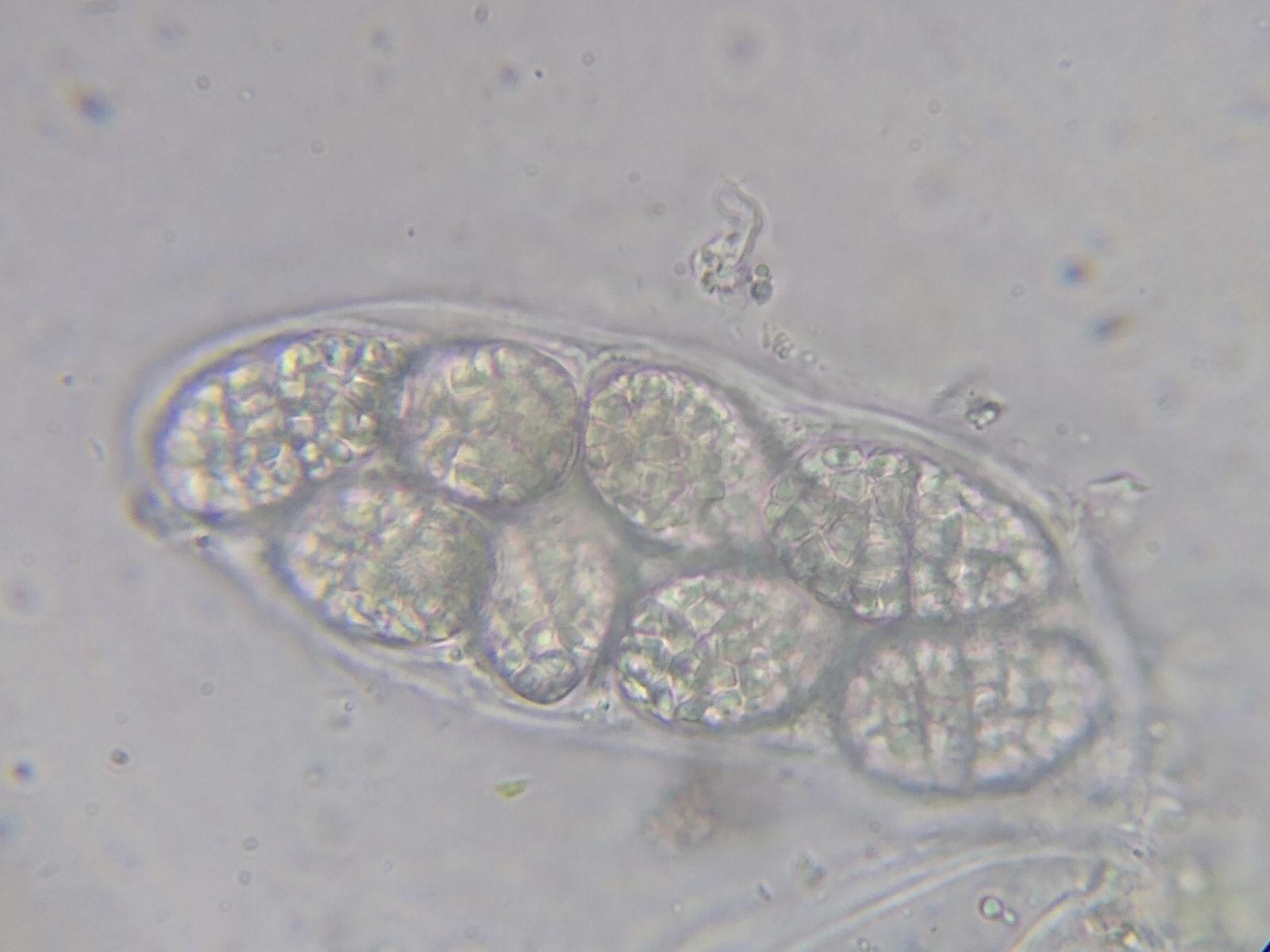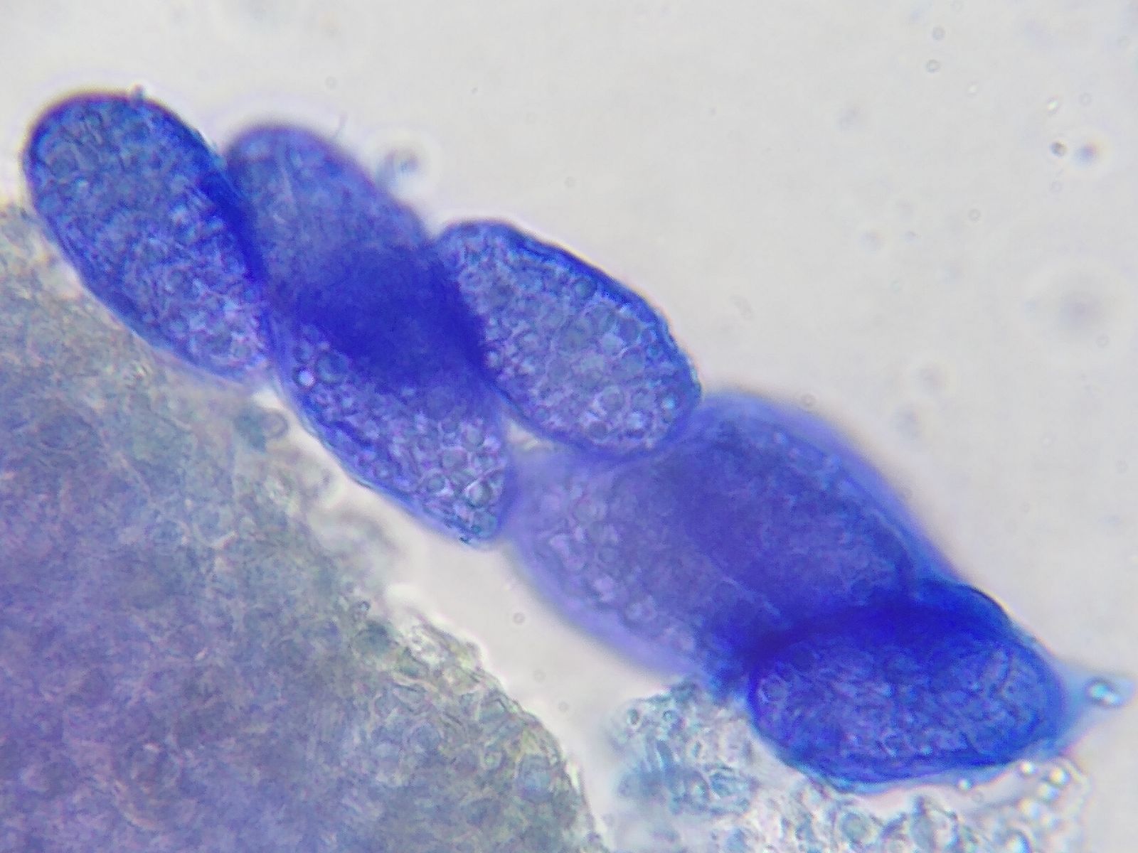 In den Schläuchen sind 2 farblose, gemauerte Sporen erkennbar.