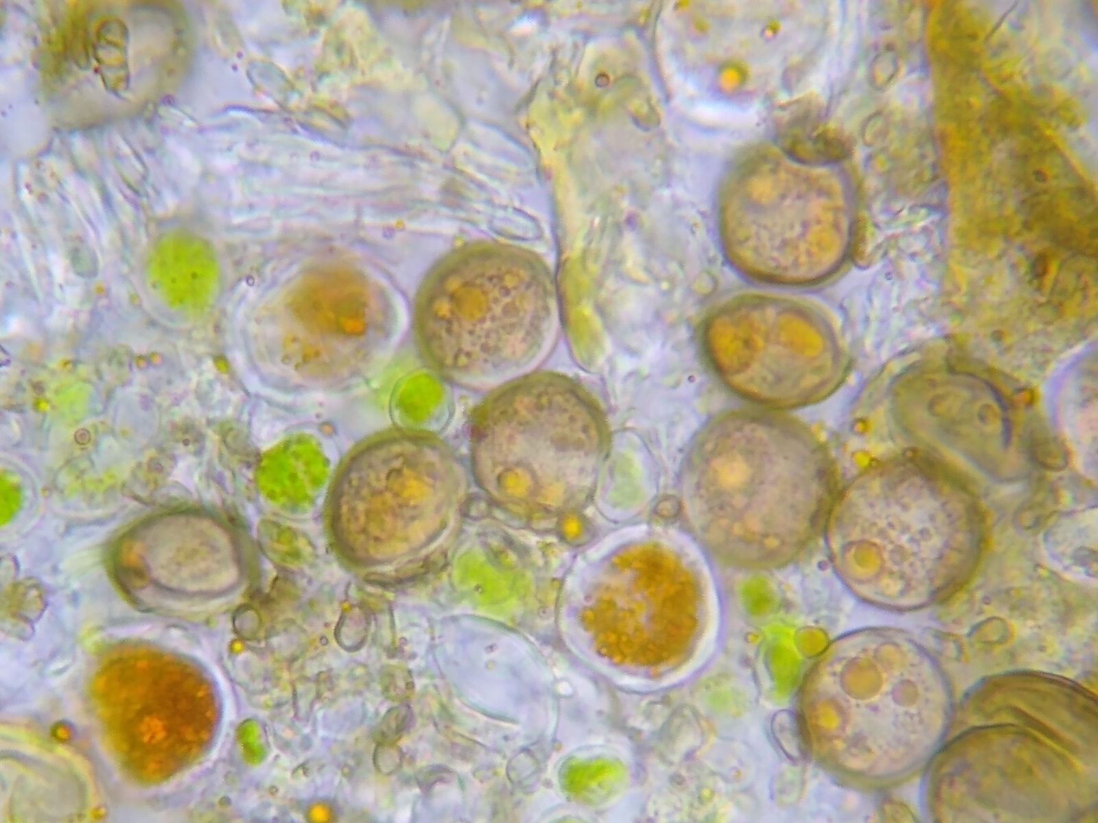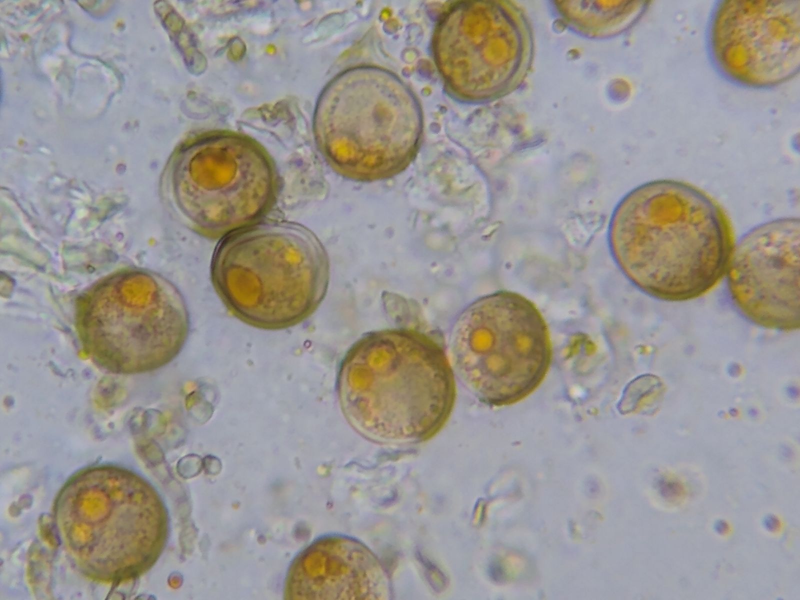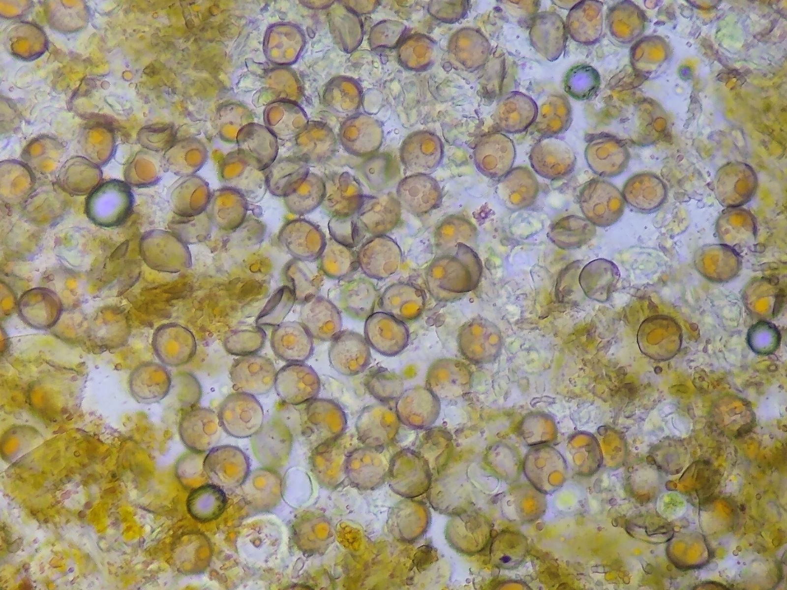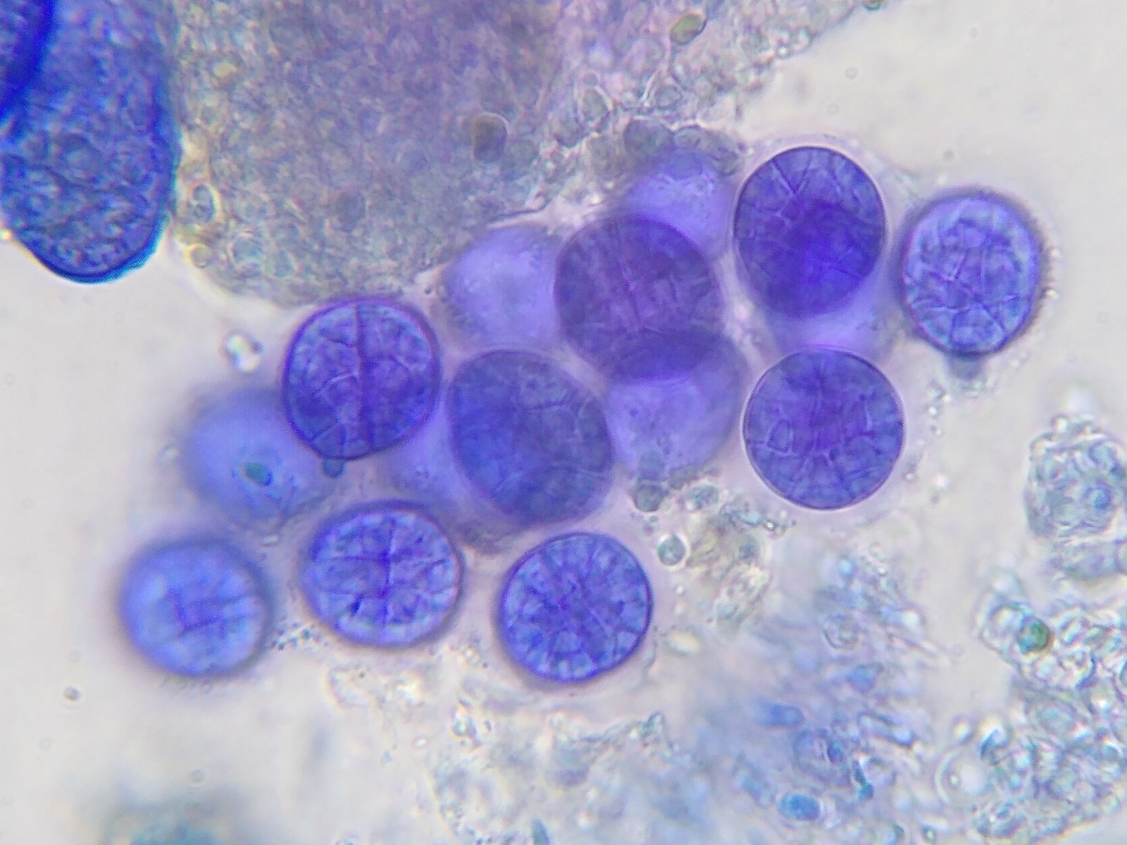 Bild 11 Stelle im gequetschten Hymenium mit 15/16 kugeligen Sporen, vermutlich aus/in einem Ascus.