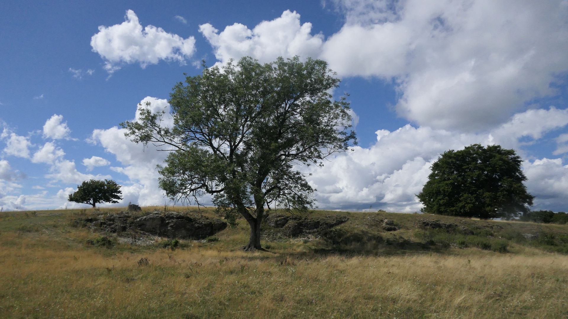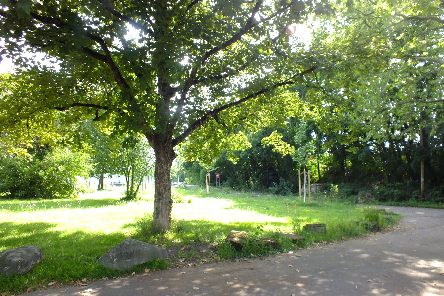 Am Rand der benachbarten Großstadt befindet sich eine etwas verwahrloste, baumbestandene Grünfläche, die mit großen Steinquadern gegen Befahren geschützt wird.