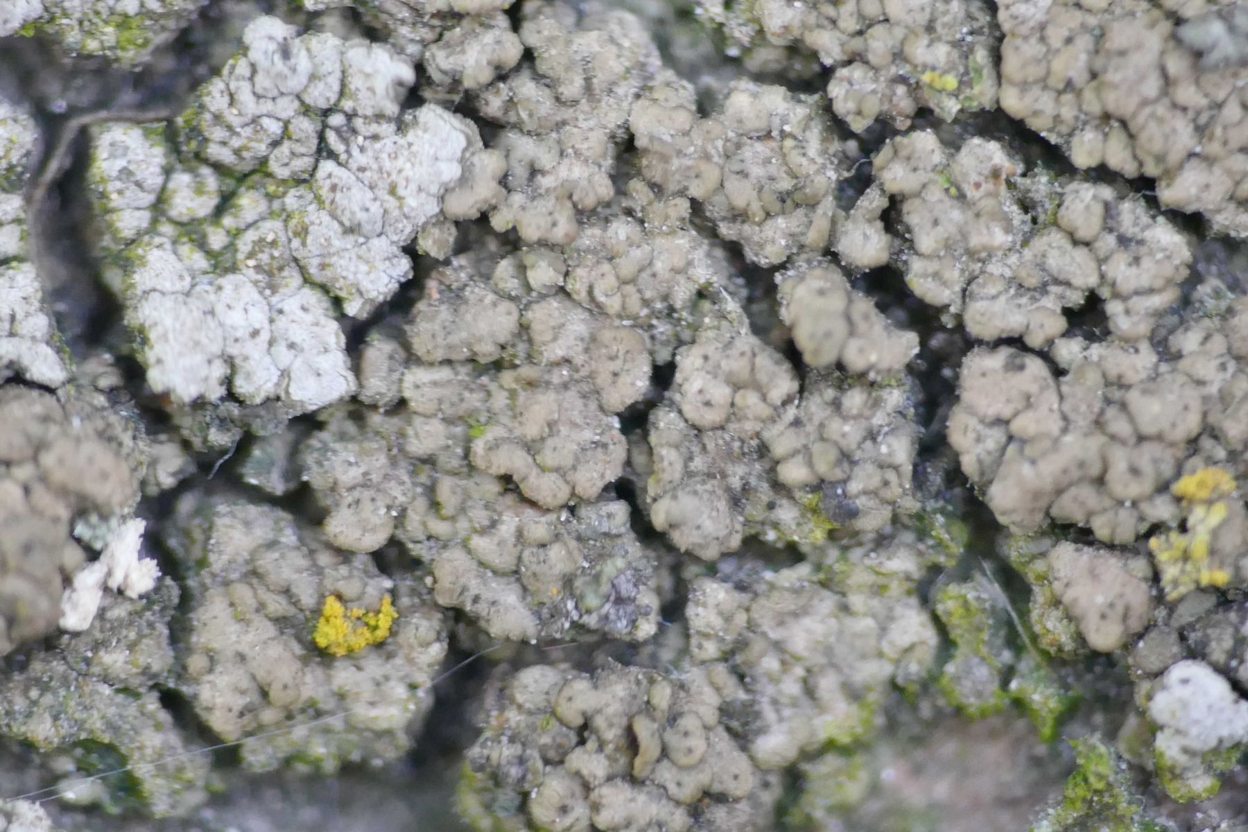 Ein Stück weiter findet sich eine schuppige, grau-grüne Krustenflechte mit gelben Apothecien.Der (feuchte) Thallus ist ohne jegliche Gelbtöne, nicht rosettig.