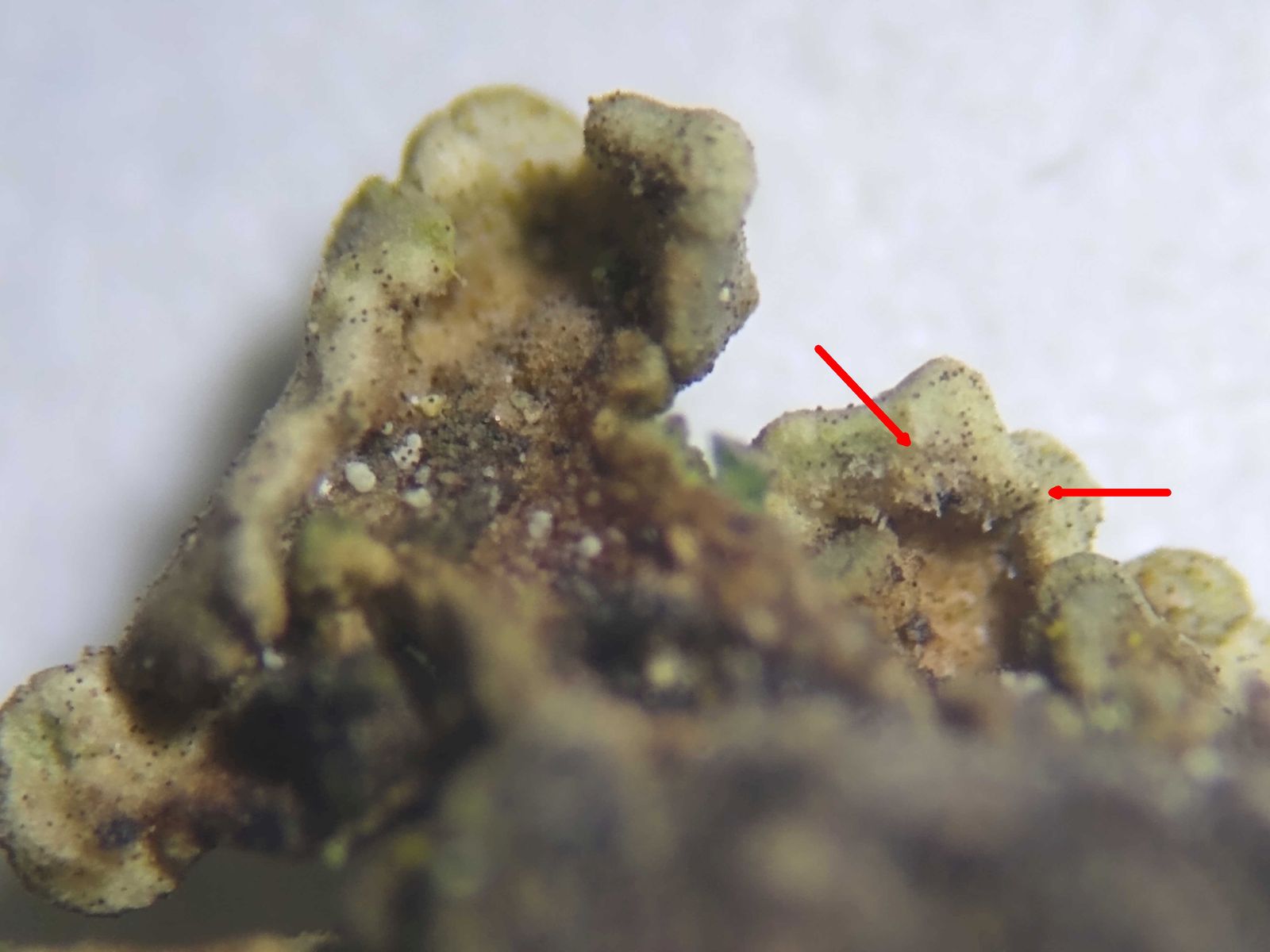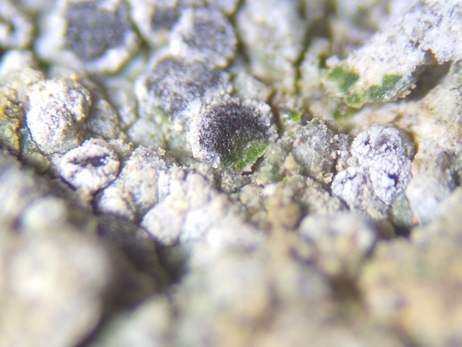 Es gibt Stellen mit bläulich-weißen Schuppen, deren Ränder aufsteigen und dunkle Soredien bilden, offensichlich Acarospora moenium;