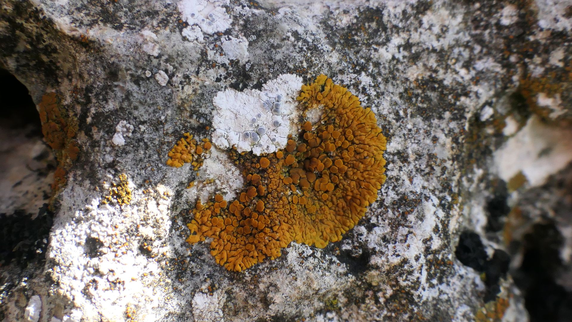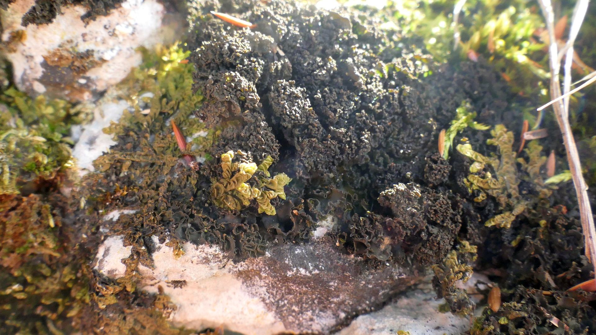 An einer nicht ganz vertikalen Stelle ist die westausgerichtete Mauer mit fein-pulvrigem Erdüberzug versehen und dick mit mehreren Arten Erdflechten bewachsen: