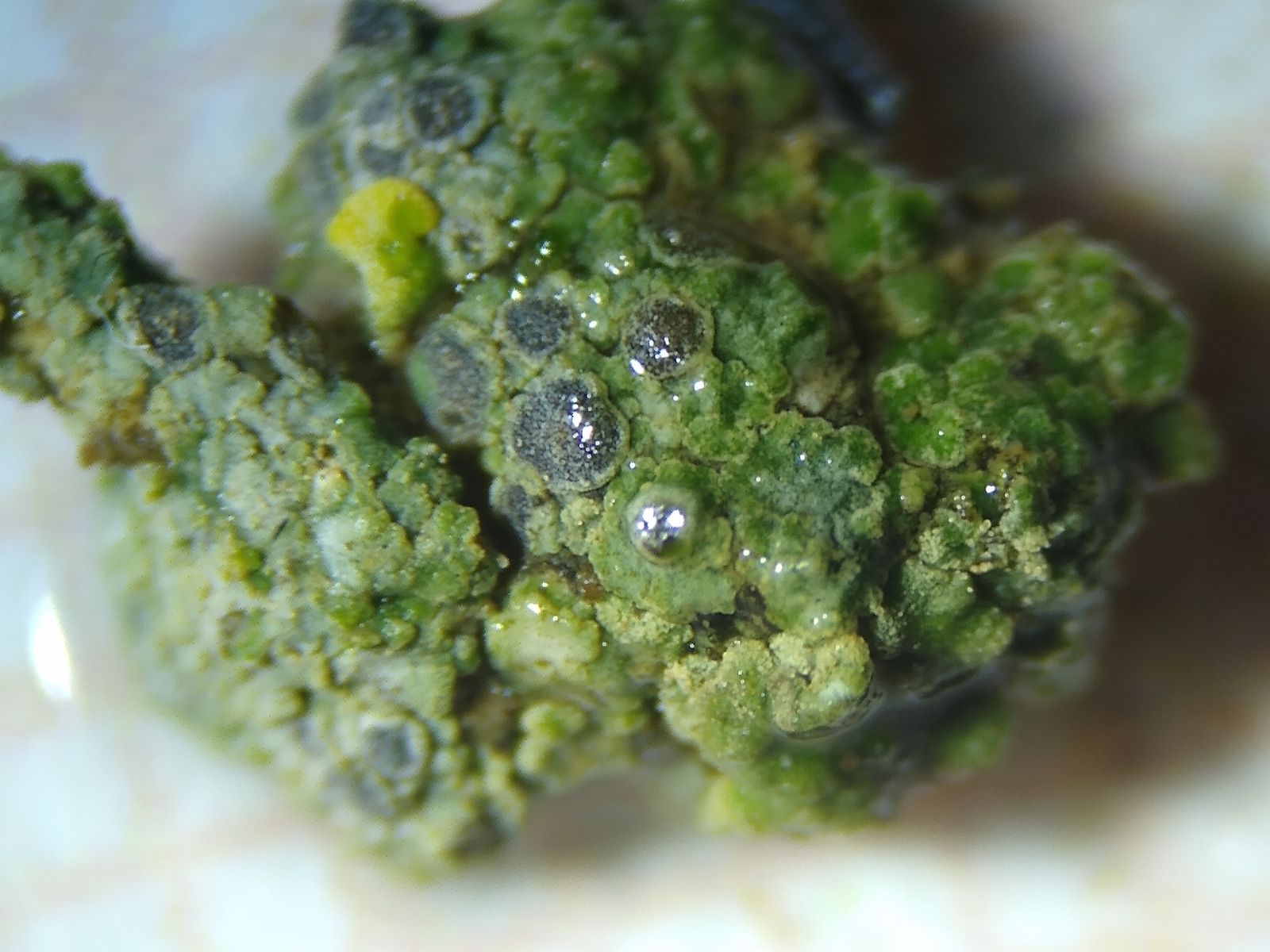 Bild 6 Angefeuchtet grünt der Thallus. Die Apothecien werden gallertig weich.