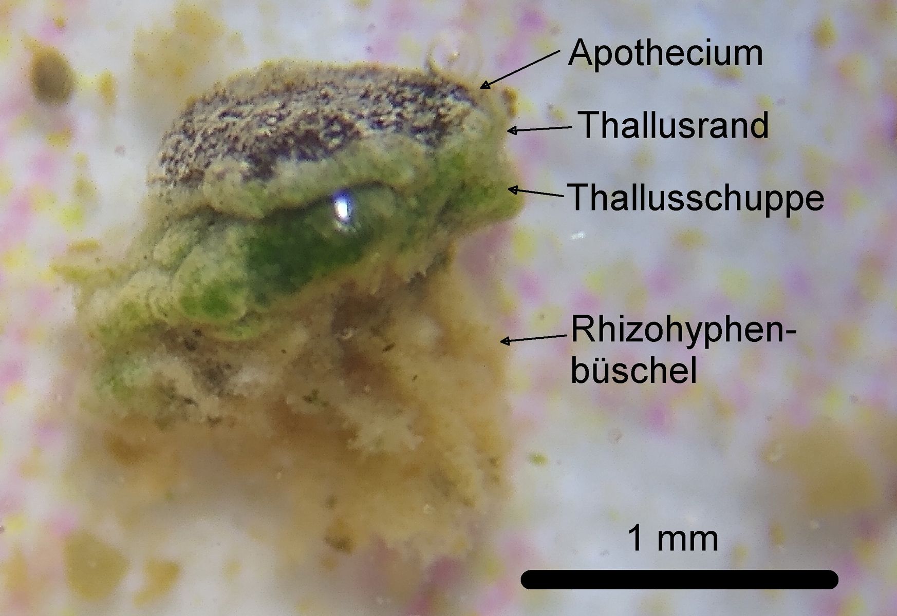 Apothecium aufsitzend, Scheibe nass dunkelbraun; Rhizohyphenbüschel unter der Thallusschuppe.
