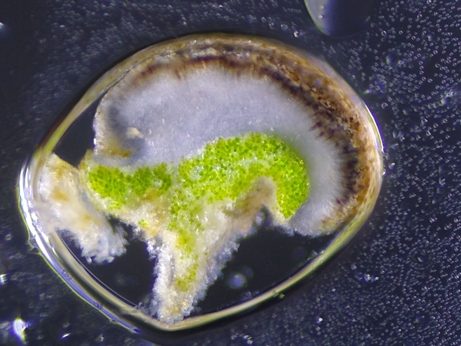Bild 7 Der Querschnitt zeigt ein durch die enthaltenen Algen intensiv grünes Inneres (100x in Wasser, Auflicht).