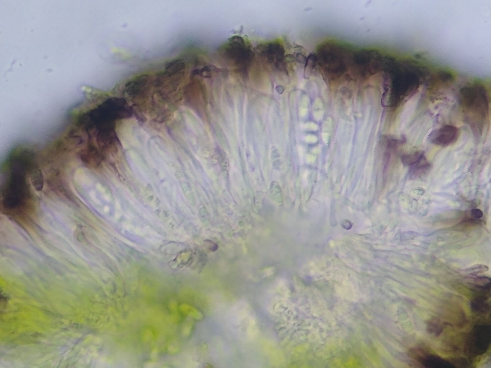 Die Paraphysen sind kopfig mit braunen Pigmentkappen.