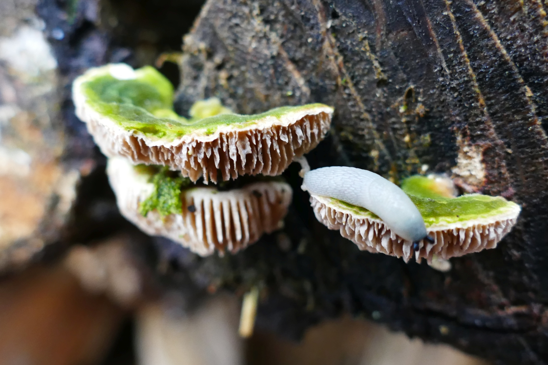 1) Die ersten, sehr hellen, feinporigen Fruchtkörper wachsen auf einem Laubbaumstumpf (Rotbuche) mitten im feuchten Wald.