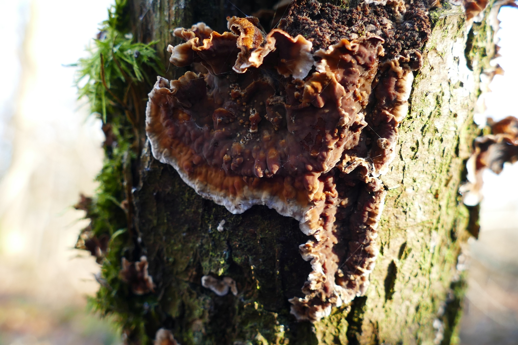 Vermutlich Stereum gausapatum, der Zottige Eichenschichtpilz: