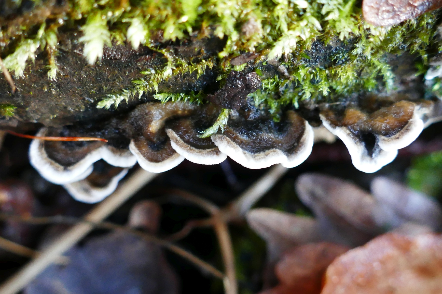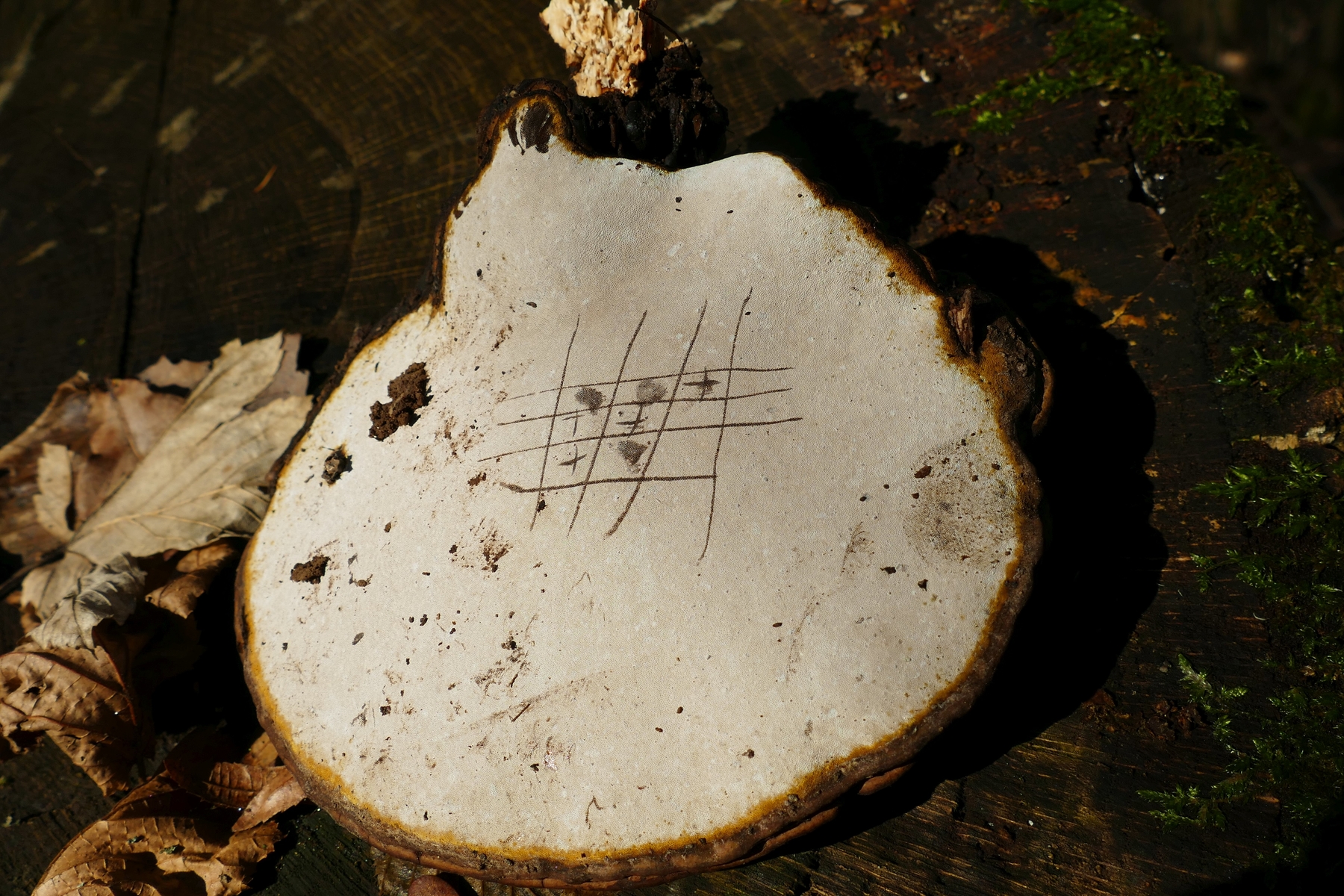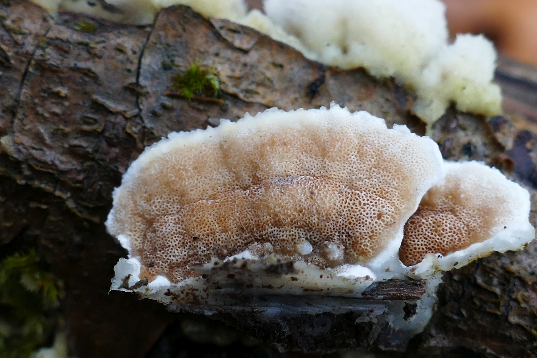 1) Gleich neben dem Parkplatz, an einem Stuppen ein kräftiger konsolenförmiger, gezonter Pilz mit einer Mischung aus mäandernden Lamellen und einigen Poren.