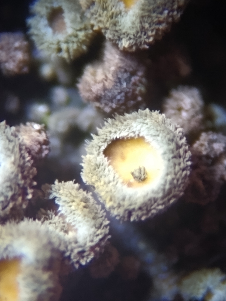 Er besitzt, passend zur Jahreszeit, einen pelzigen Rand und ein gelbes Hymenium.