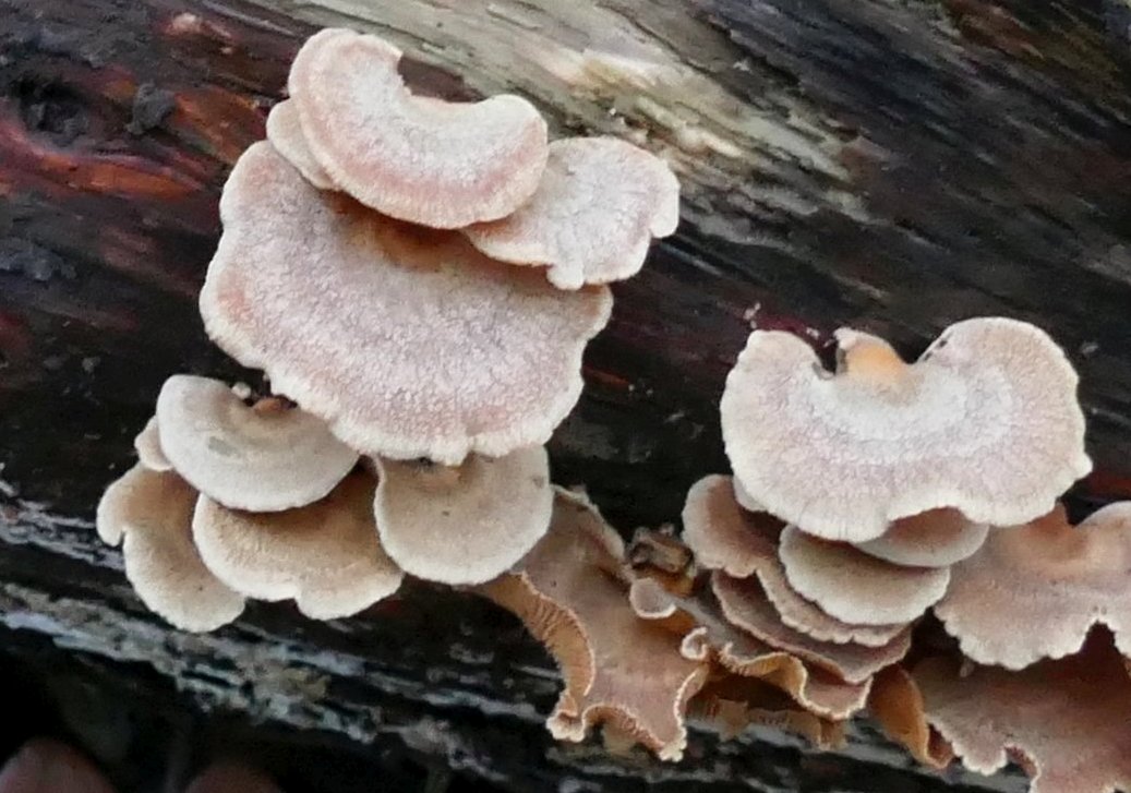 Unter dem Mikroskop fand ich bei beiden Proben Kristalle in der Medulla und rundliche Zellen (vgl. Bild 9&10); die gleichen Sporen mit vielen kleinen Öltröpfen (vgl. Bild 6), insgesamt kein Unterschied zur allerersten Probe vom Baumstamm von vor einer Woche - es sollte sich also um den gleichen Pilz handeln.