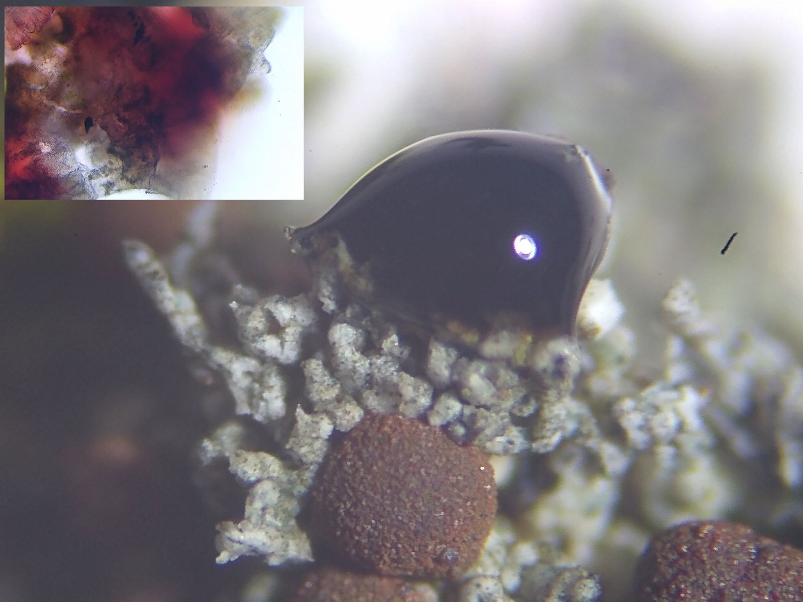 Bild 14 Thalloidimia physaroides bleibt meist steril und bildet kleine, aufrecht stehende Keulen (Bildeinsatz).