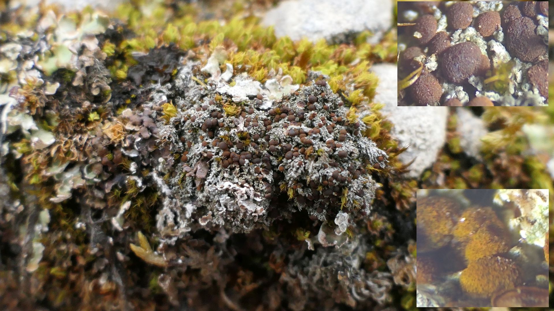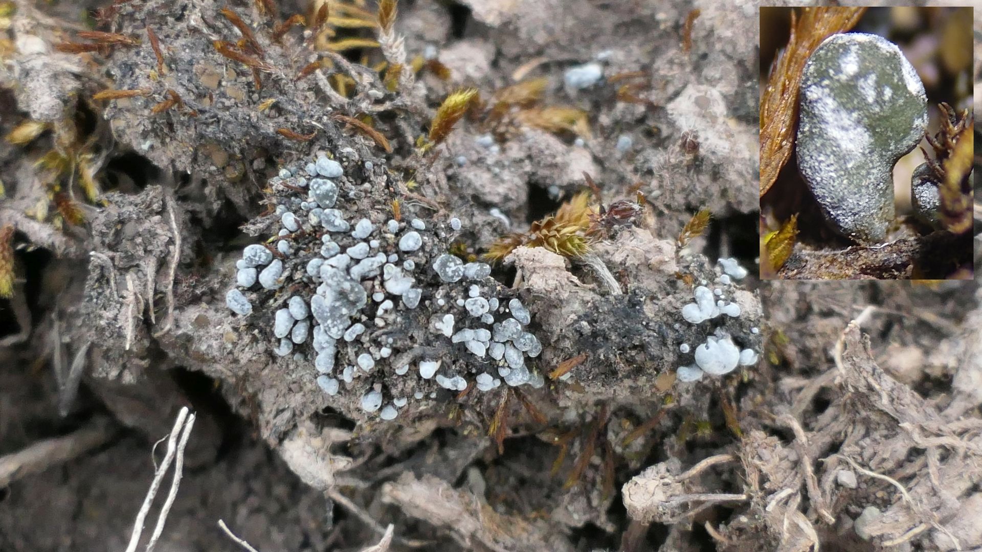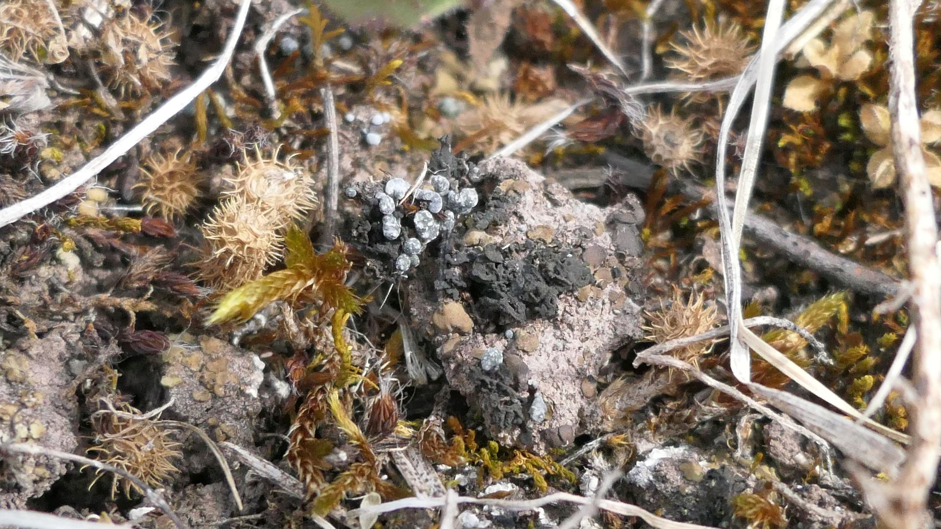 bläulich-graue Kügelchen, braune Schüppchen und schwarze Klumpen - typische Erdflechten.