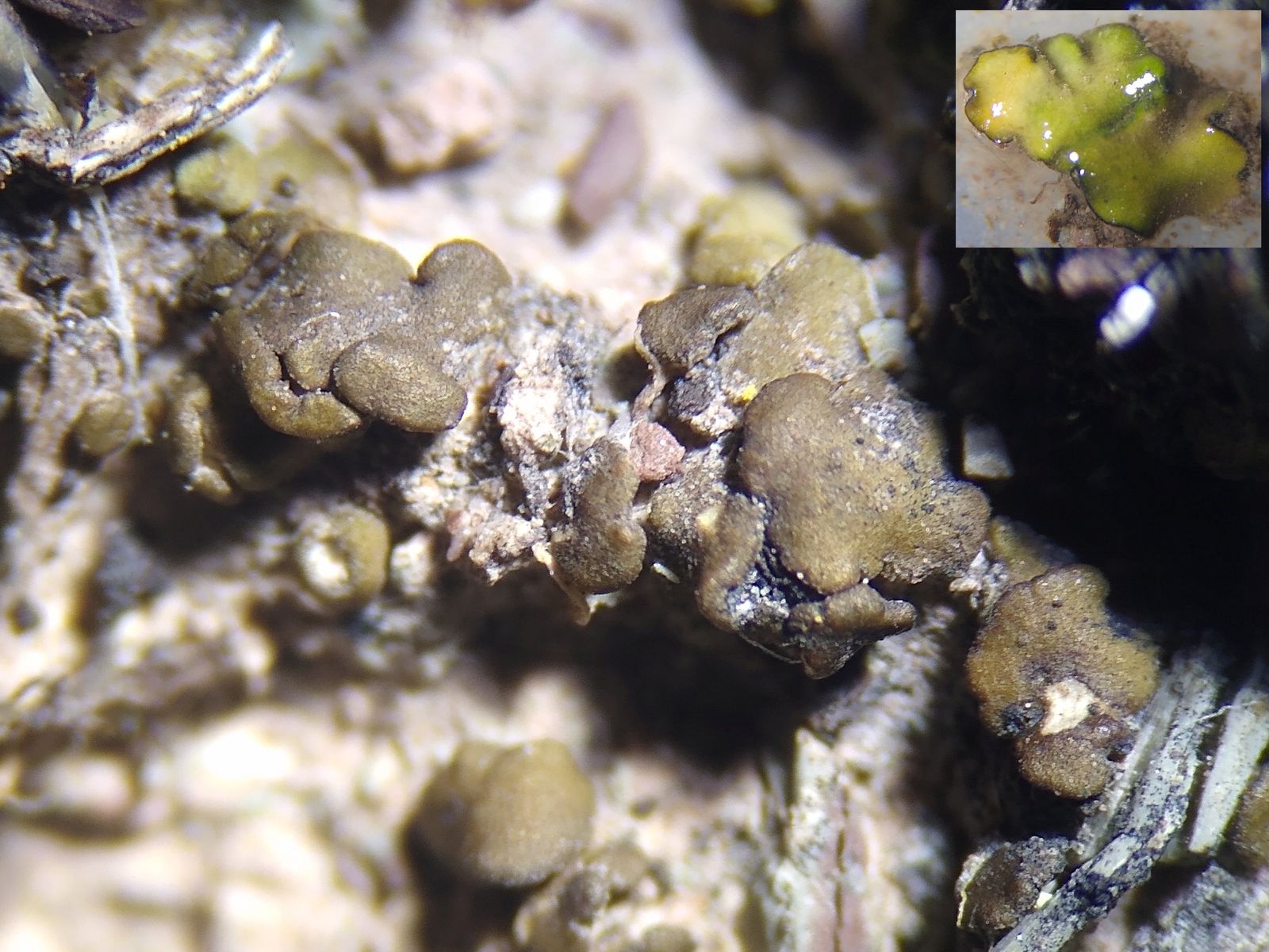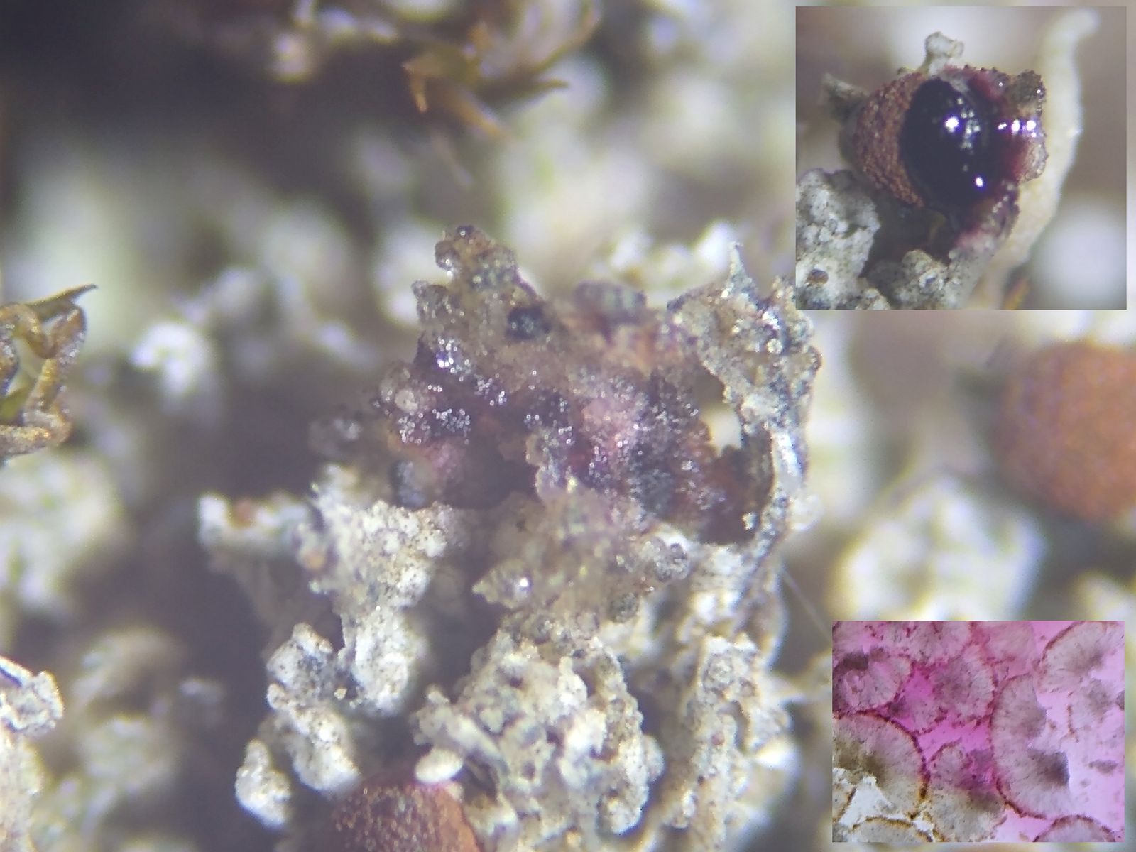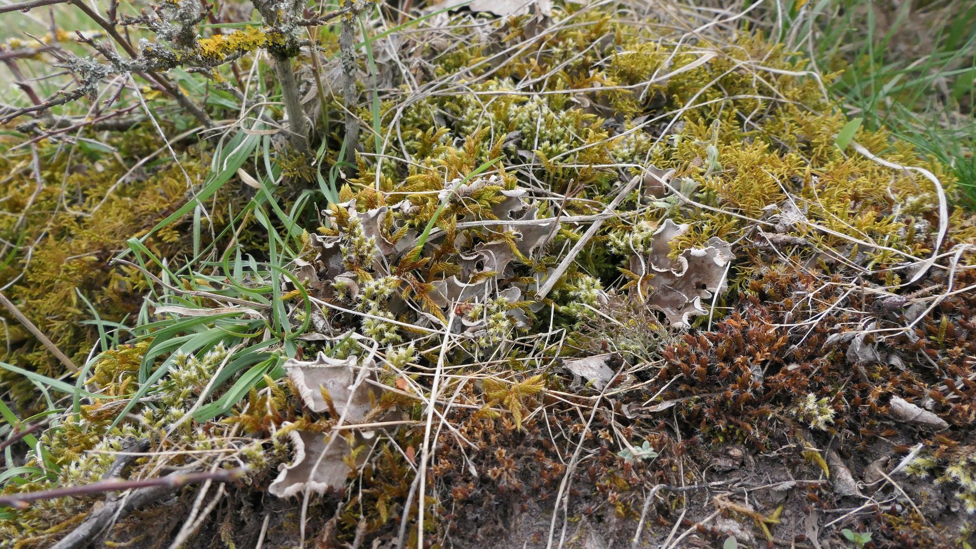 bläulich-graue Kügelchen, braune Schüppchen und schwarze Klumpen - typische Erdflechten.