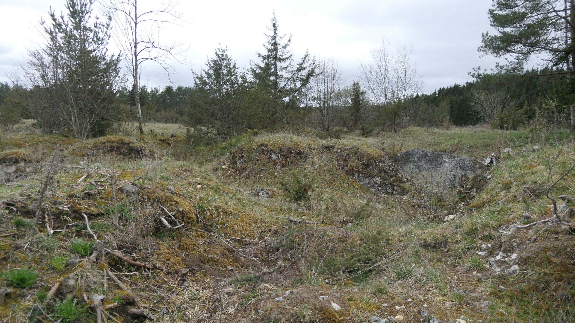 Zwischen den Bäumen liegen kleinere Kalkfelsen und Gipsbrocken.