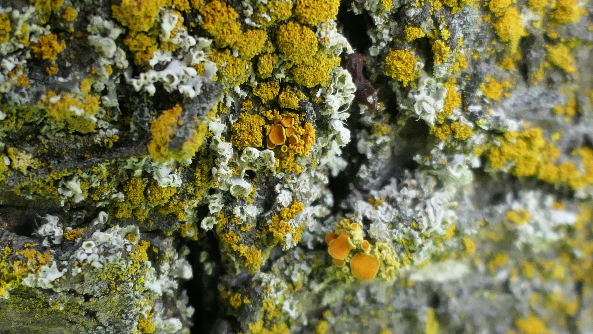 Bild 3 Farbspiel in der Frühlingssonne: Die allgegenwärtige Gelbflechte (X. parietina) und der kupferbraunen Blattflechte (Melanelixia subaurifera) im Subzeitlupenringen um Platz und Licht.