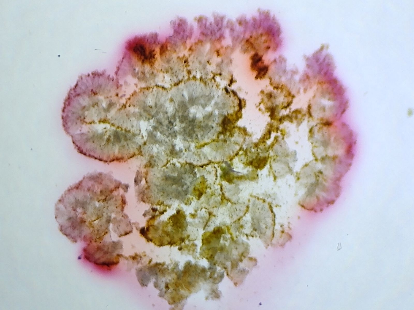 Interessanterweise finden sich auf beiden Seiten des dünnen Steinchplättchens ähnlich viele Apothecien!