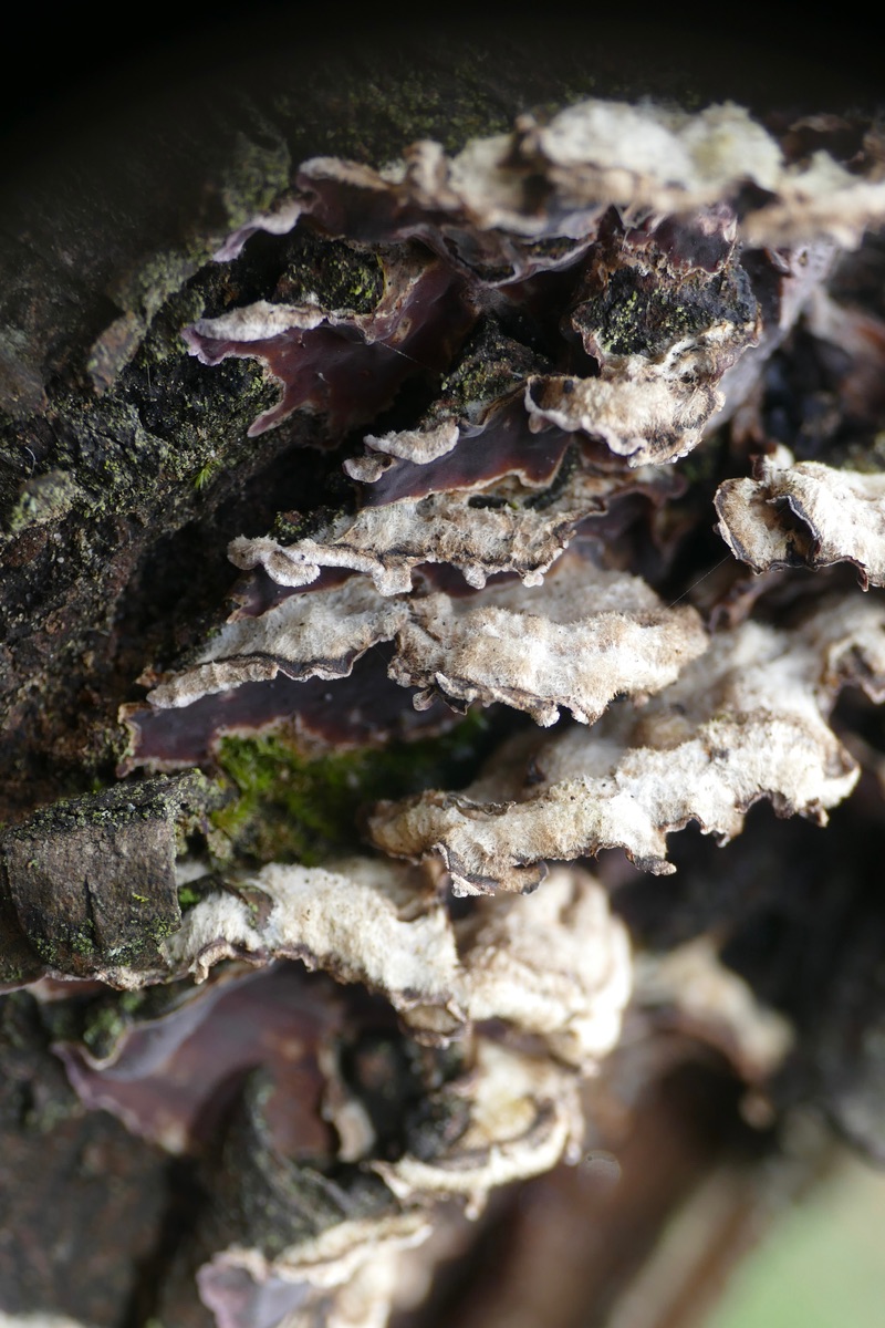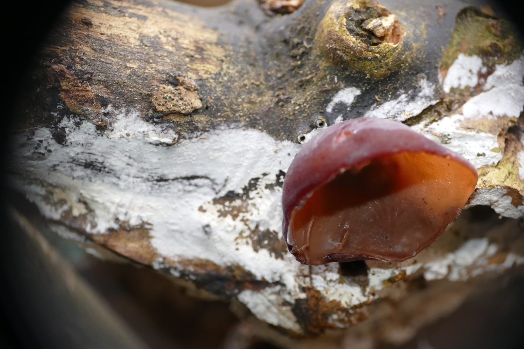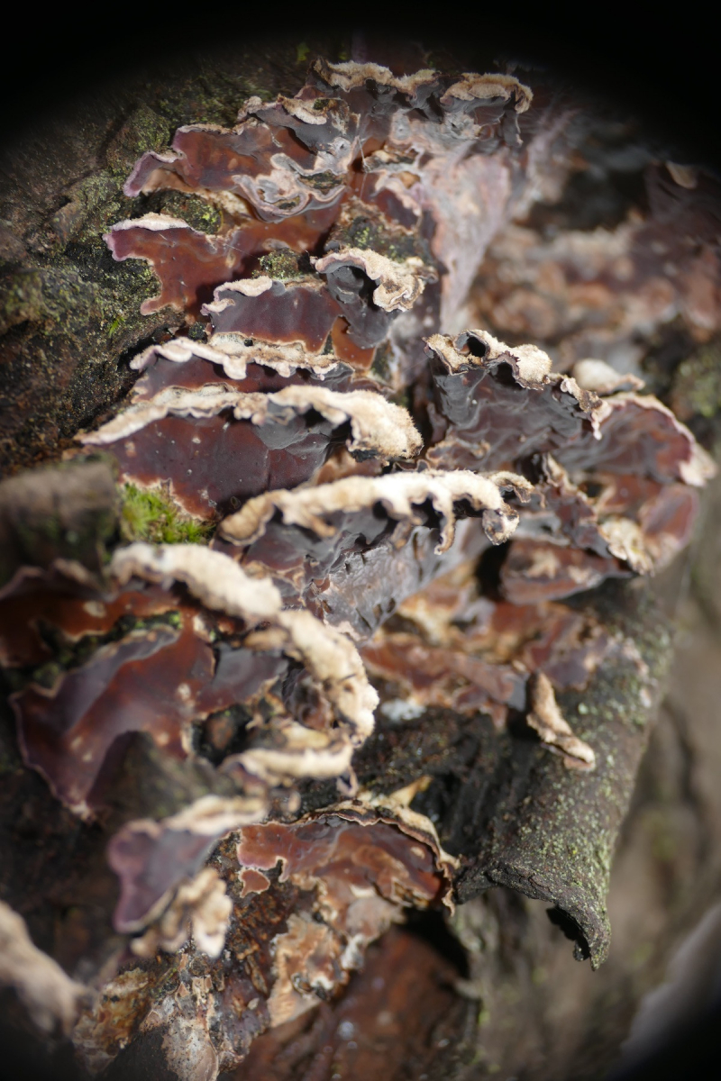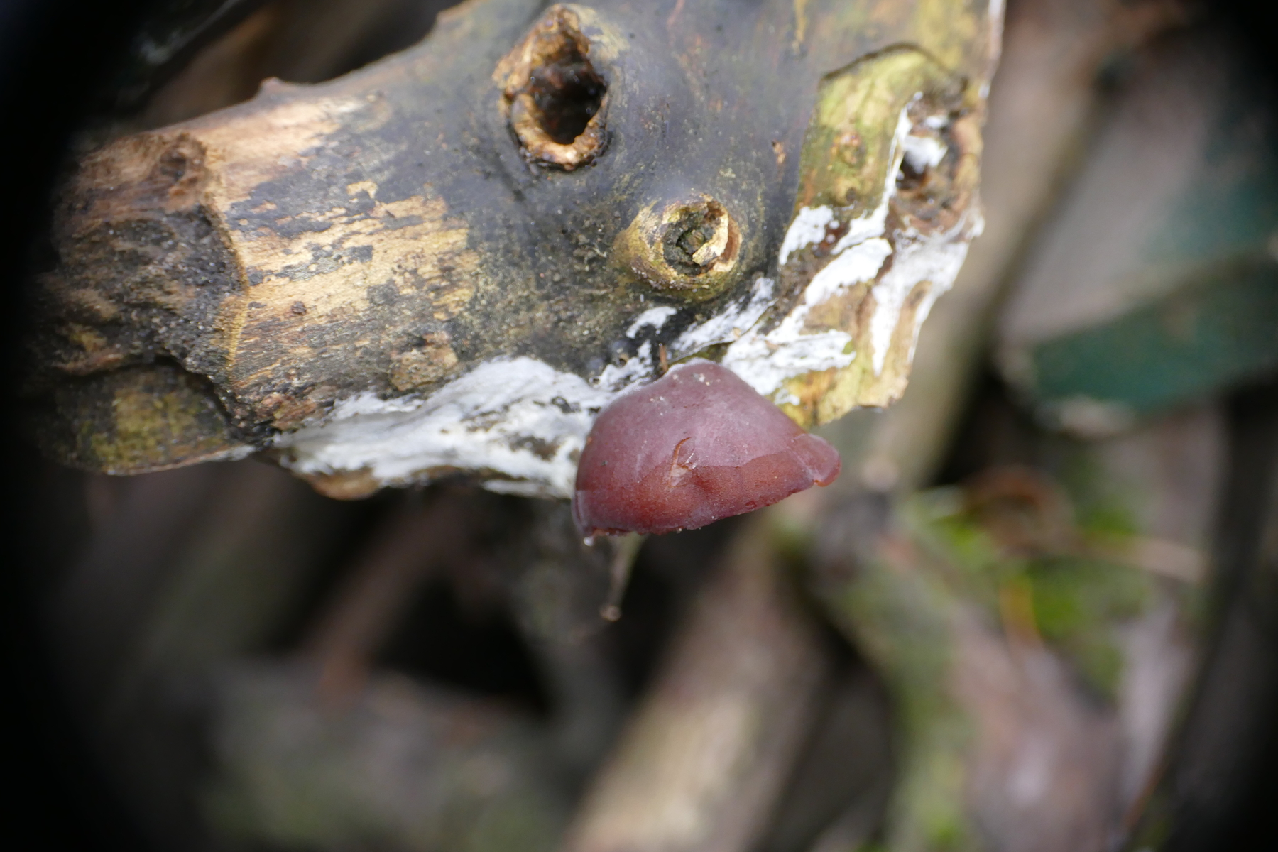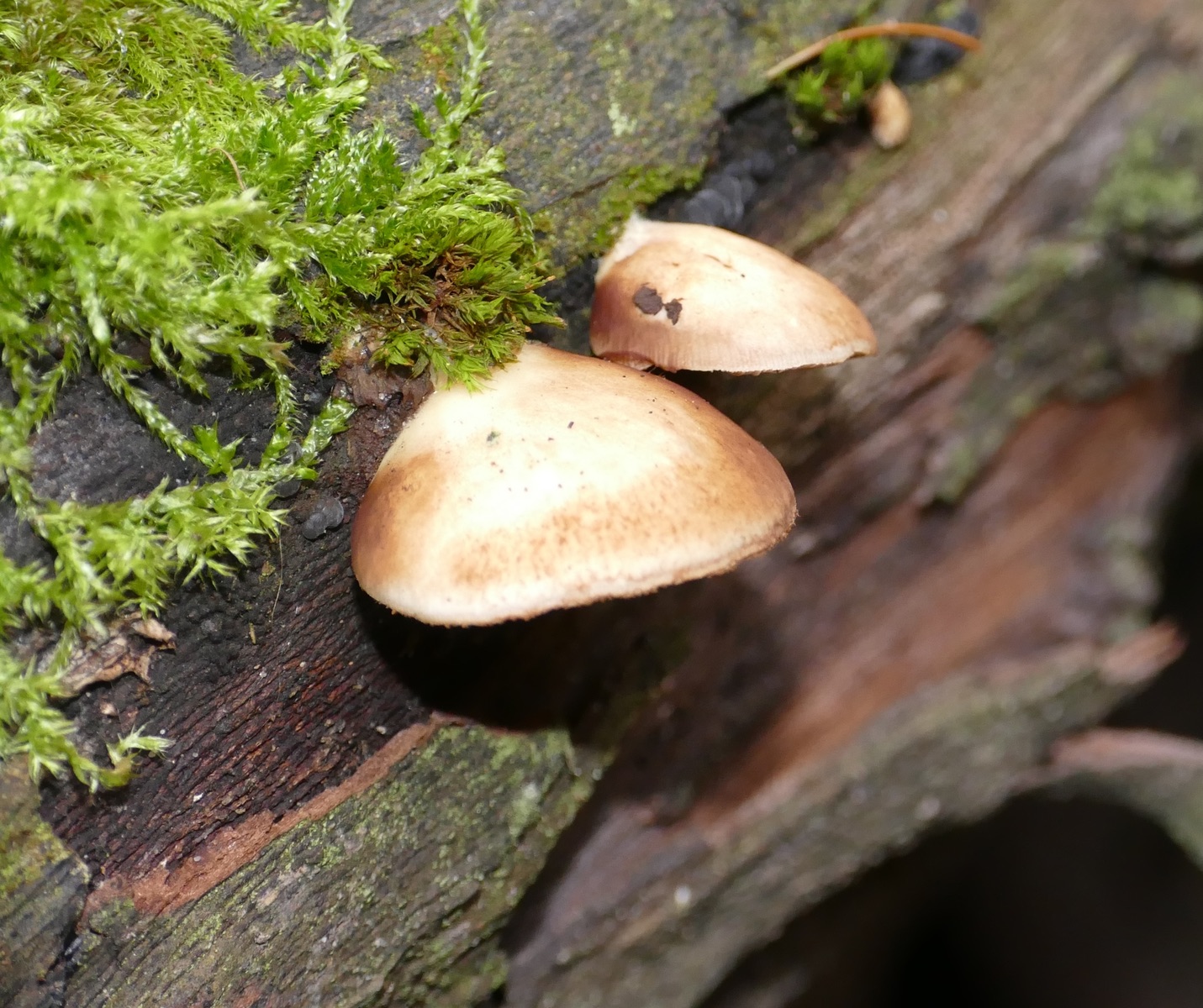Zunächst die bräunlichen Pilze: Sie wachsen am Totholz und sind 1 cm im Durchmesser oder kleiner. (die ersten 3 Bilder)