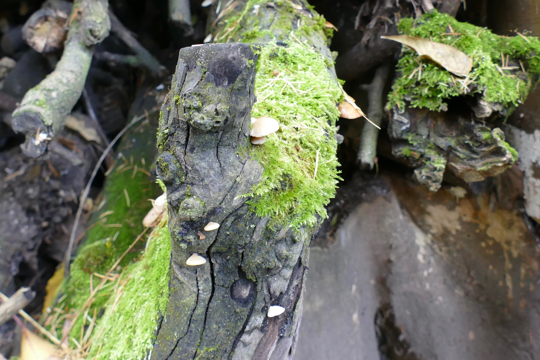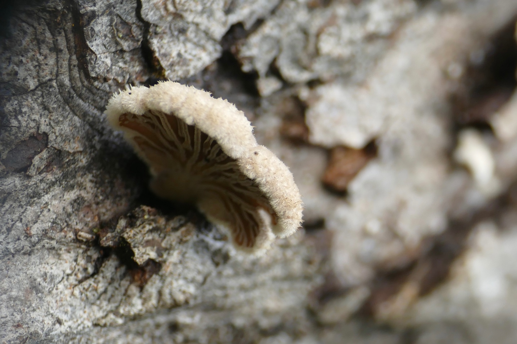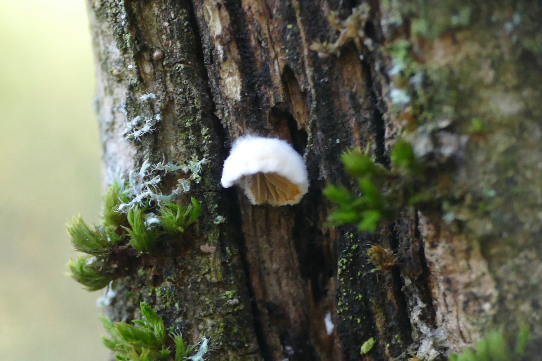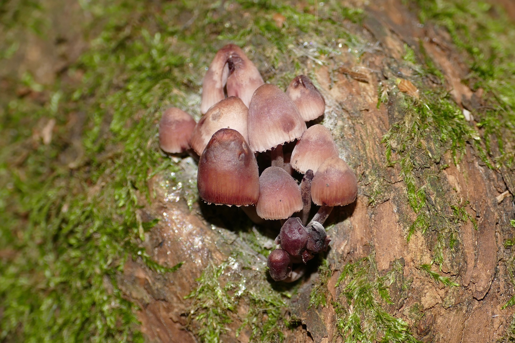 Zunächst die bräunlichen Pilze: Sie wachsen am Totholz und sind 1 cm im Durchmesser oder kleiner. (die ersten 3 Bilder)