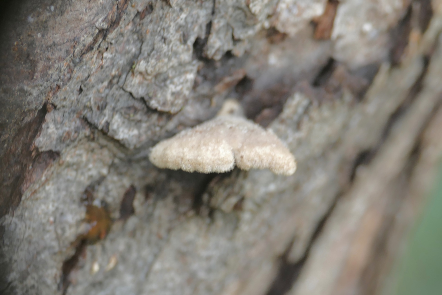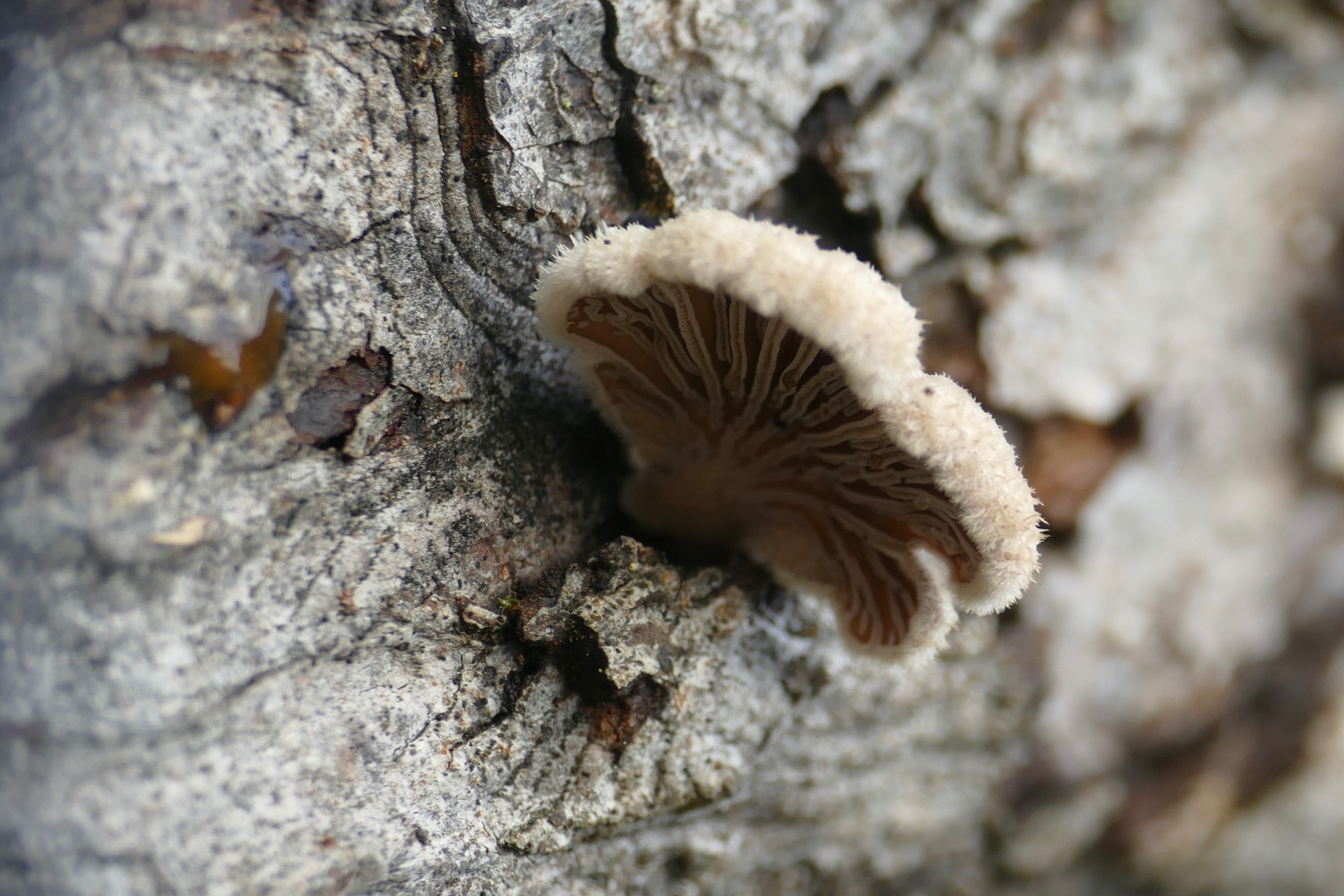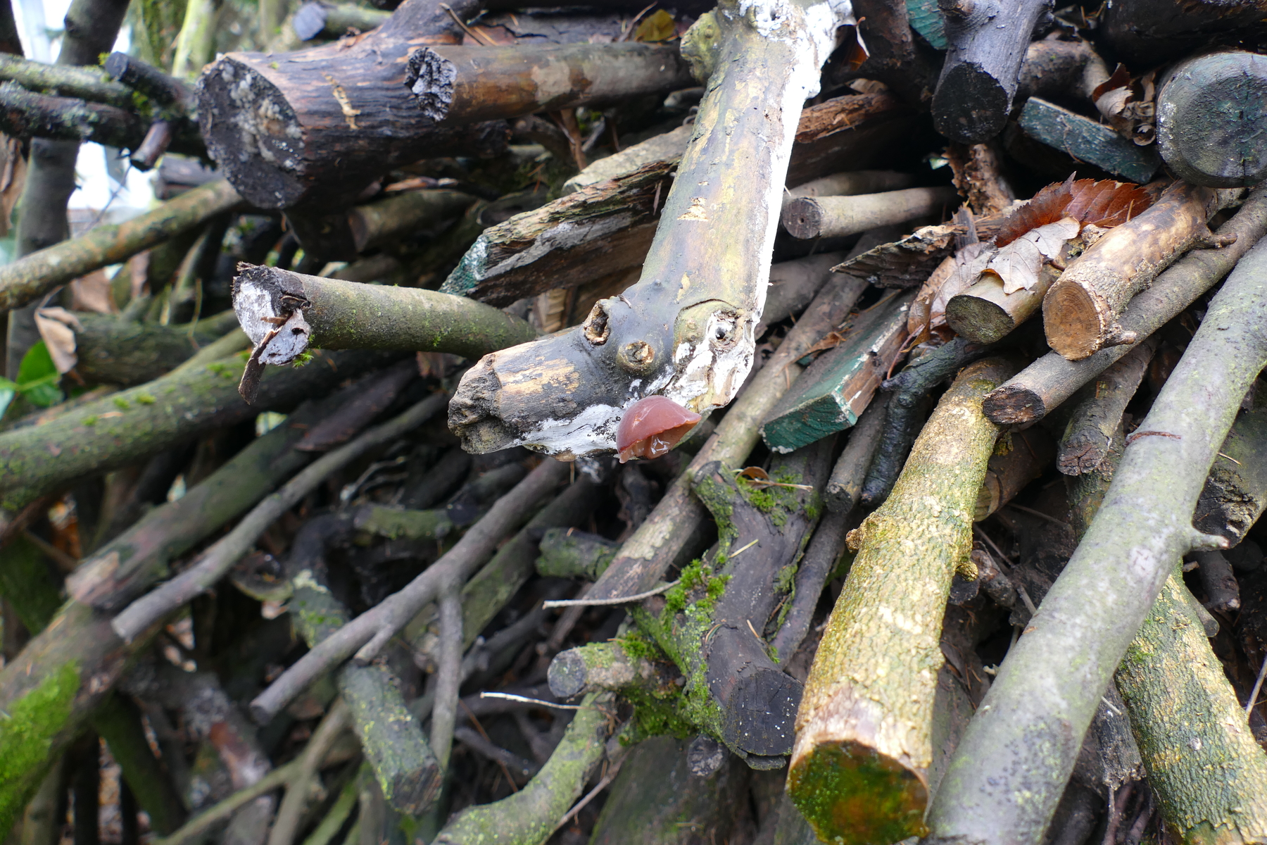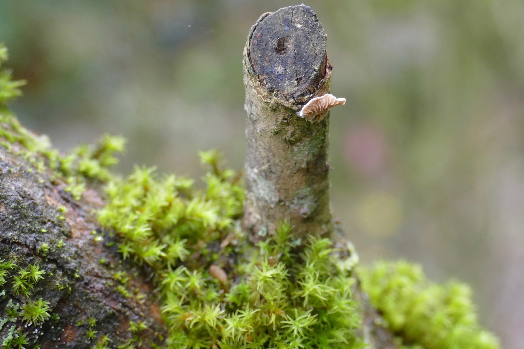 Zunächst die bräunlichen Pilze: Sie wachsen am Totholz und sind 1 cm im Durchmesser oder kleiner. (die ersten 3 Bilder)